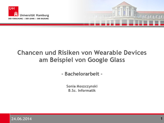 Methode |Ergebnisse | Zusammenfassung u. Ausblick „Chancen und Risiken von Wearable Devices am Beispiel von Google Glass“ 23 Sonia Moszczynski | B.Sc. Informatik • Aspekte aus der Internetrecherche, die von den befragten Glass Explorern nicht erwähnt wurden • Werbung [8] • Sprachsteuerung in der Öffentlichkeit [9] • Masse an Informationen [10] • Einschränkung der Meinungsfreiheit [11] • Glass-Verbote [12, 13] • Störung des visuellen Cortex [14] ! • Kontroverse Meinungen zw. den Befragten und Internetrecherchen • Datenschutz, Privatsphäre, Gesichtserkennung