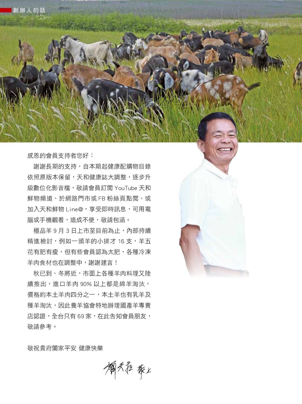 Line@,享受即時訊息,可用電 腦或手機觀看,造成不便,敬請包涵。 極品羊 9 月 3 日上市至目前為止,內部持續 精進檢討,例如一頭羊的小排才 16 支,羊五 花有肥有瘦,但有些會員認為太肥,各種冷凍 羊肉食材也在調整中,謝謝建言! 秋已到、冬將近,市面上各種羊肉料理又陸 續推出,進口羊肉 90% 以上都是綿羊淘汰, 價格約本土羊肉四分之一,本土羊也有乳羊及 種羊淘汰,因此養羊協會特地辦理國產羊專賣 店認證,全台只有 69 家,在此告知會員朋友, 敬請參考。 敬祝貴府闔家平安 健康快樂 創 辦 人 的 話