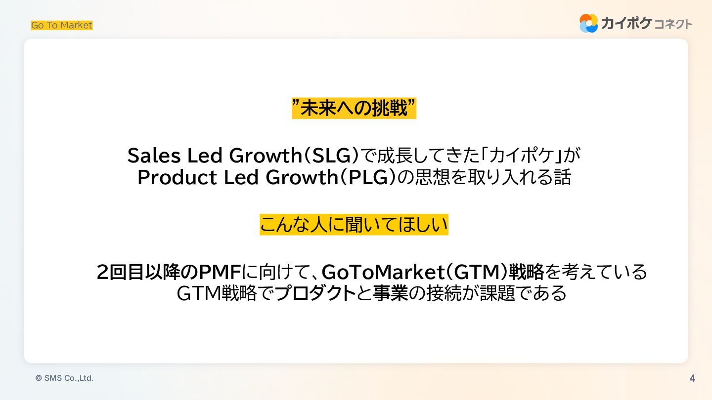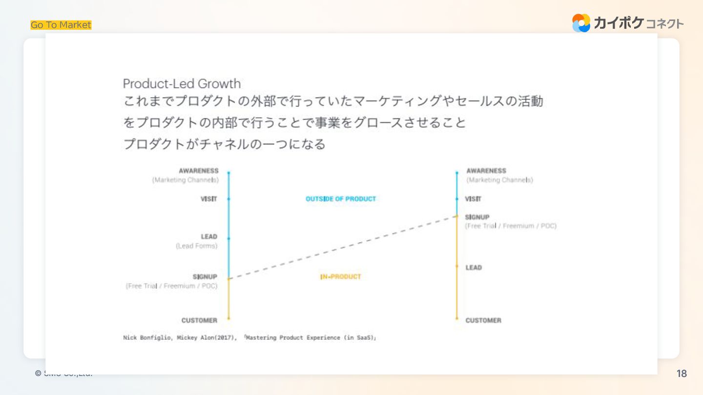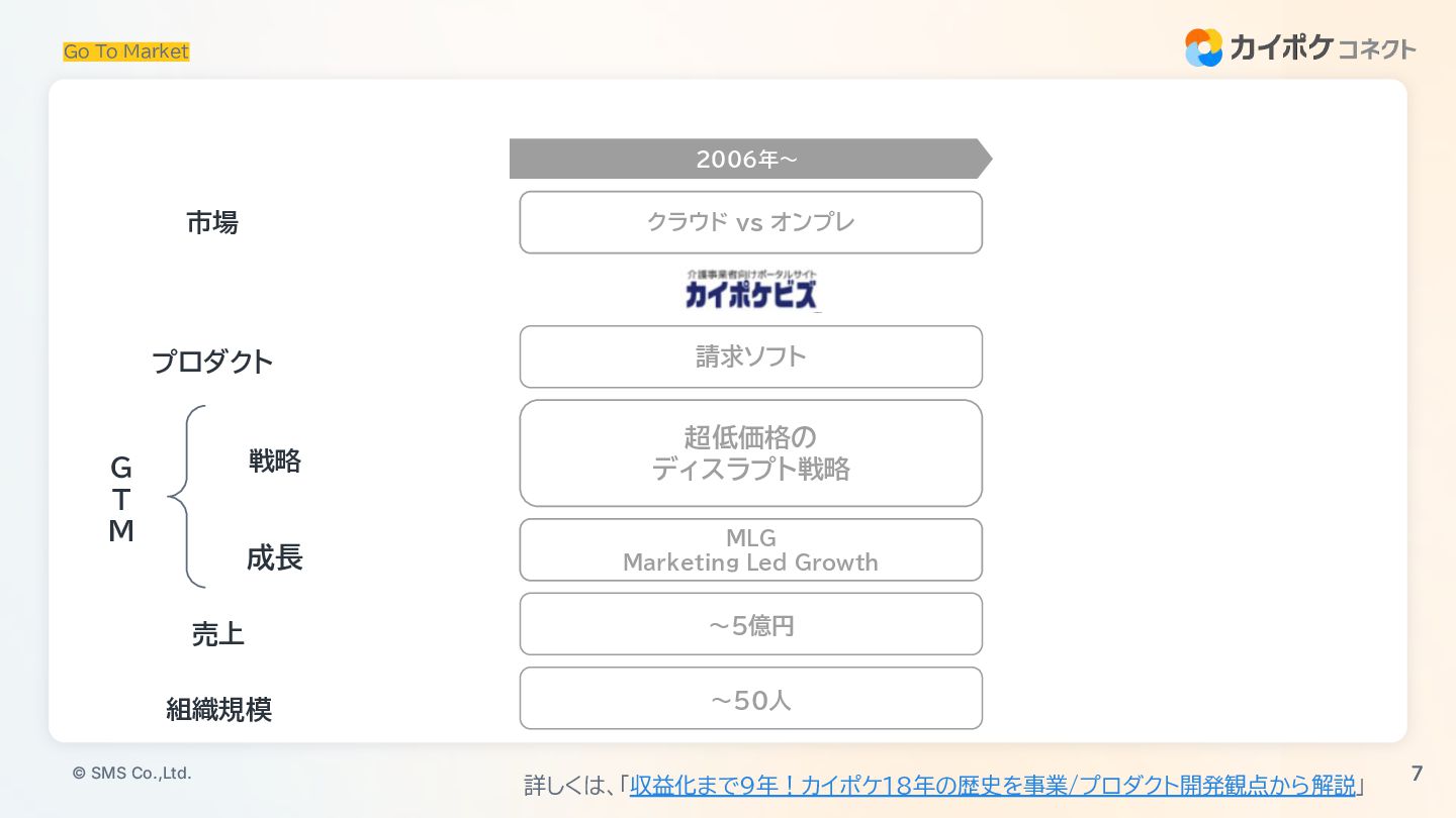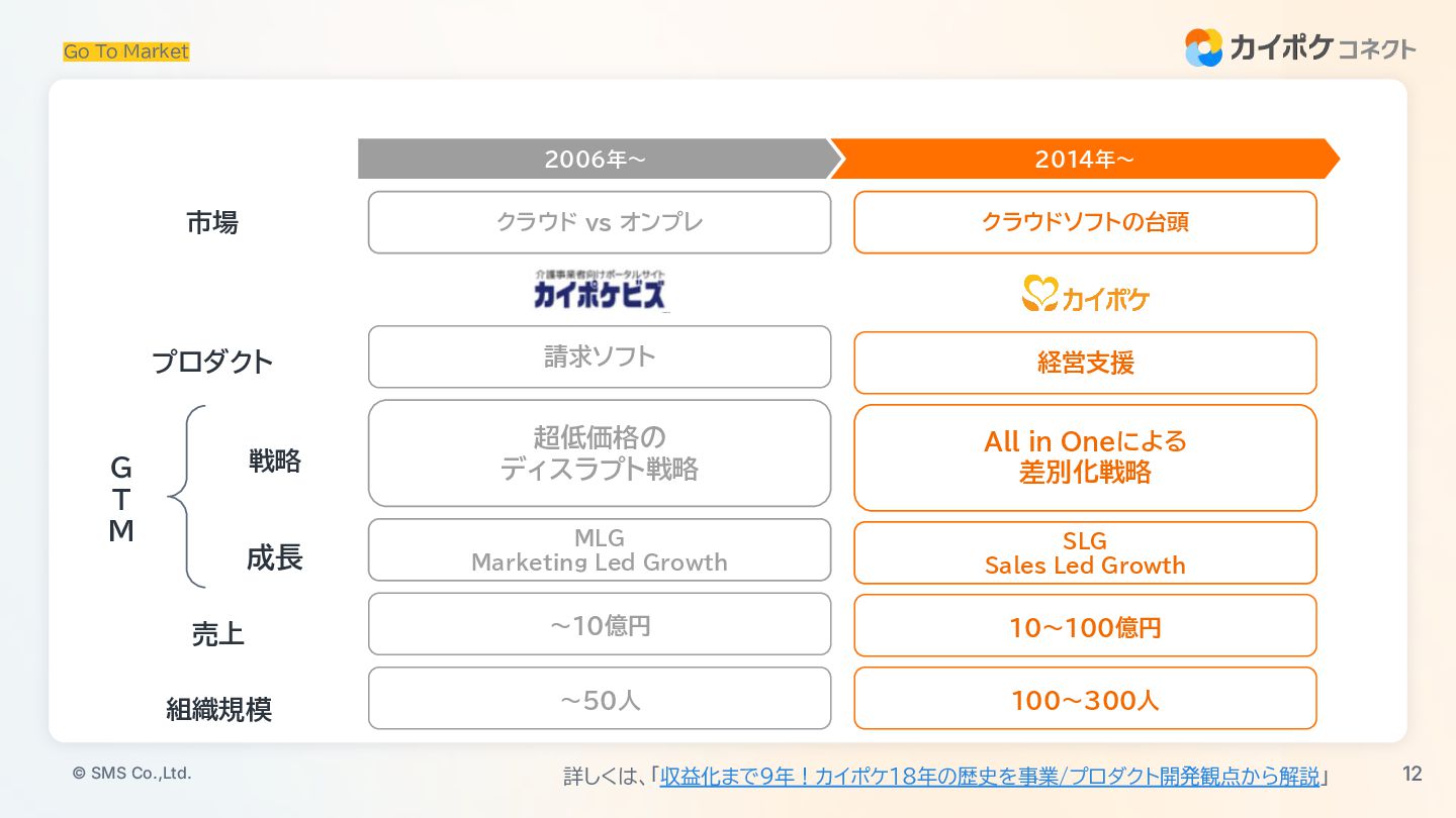 クラウド vs オンプレ クラウドソフトの台頭 成長 戦略 超低価格の ディスラプト戦略 All in Oneによる 差別化戦略 MLG Marketing Led Growth SLG Sales Led Growth 詳しくは、「収益化まで9年!カイポケ18年の歴史を事業/プロダクト開発観点から解説」 請求ソフト 経営支援 プロダクト Go To Market 組織規模 売上 10~100億円 100~300人 ~10億円 ~50人