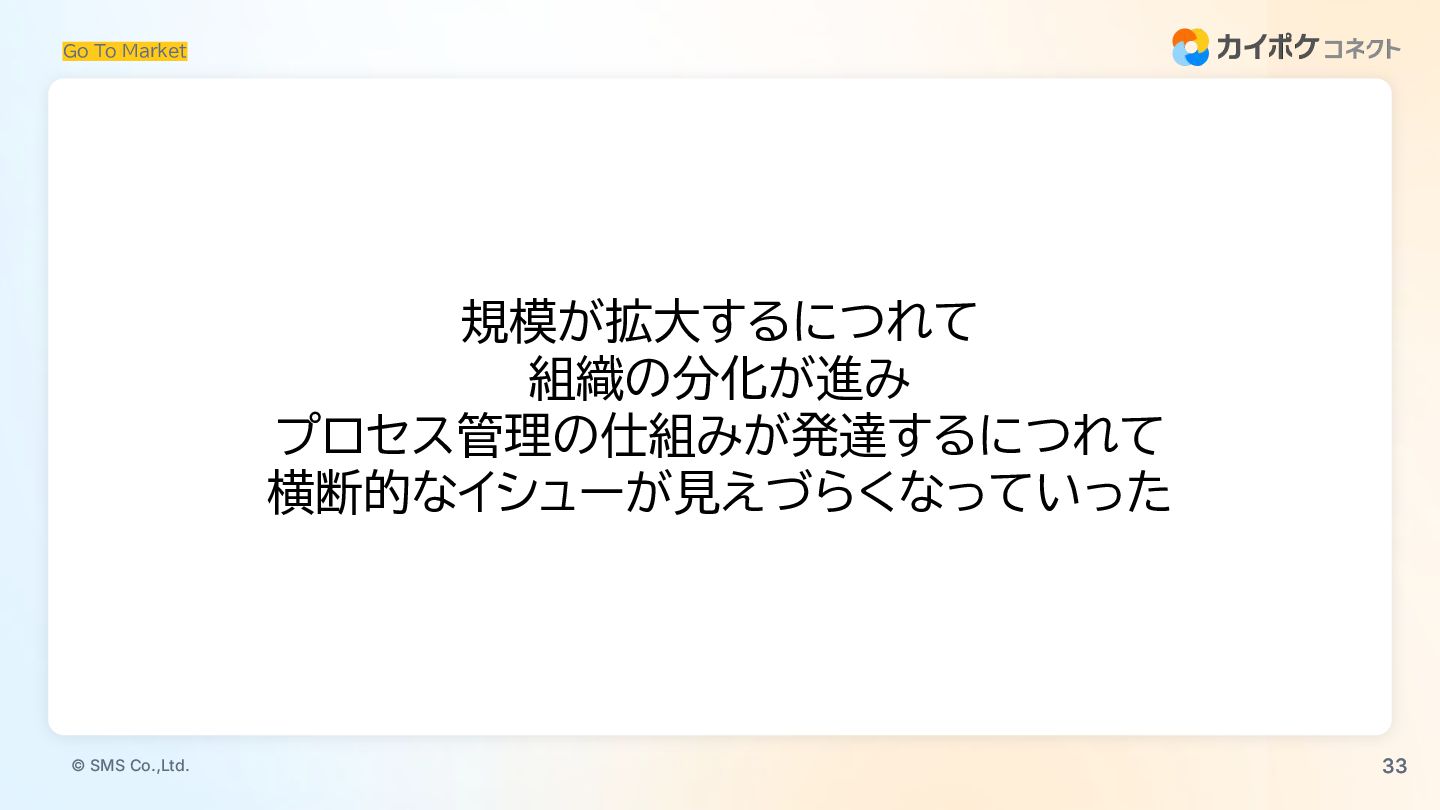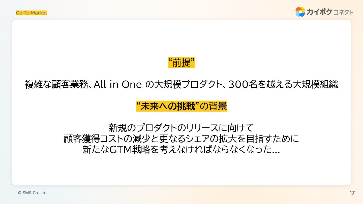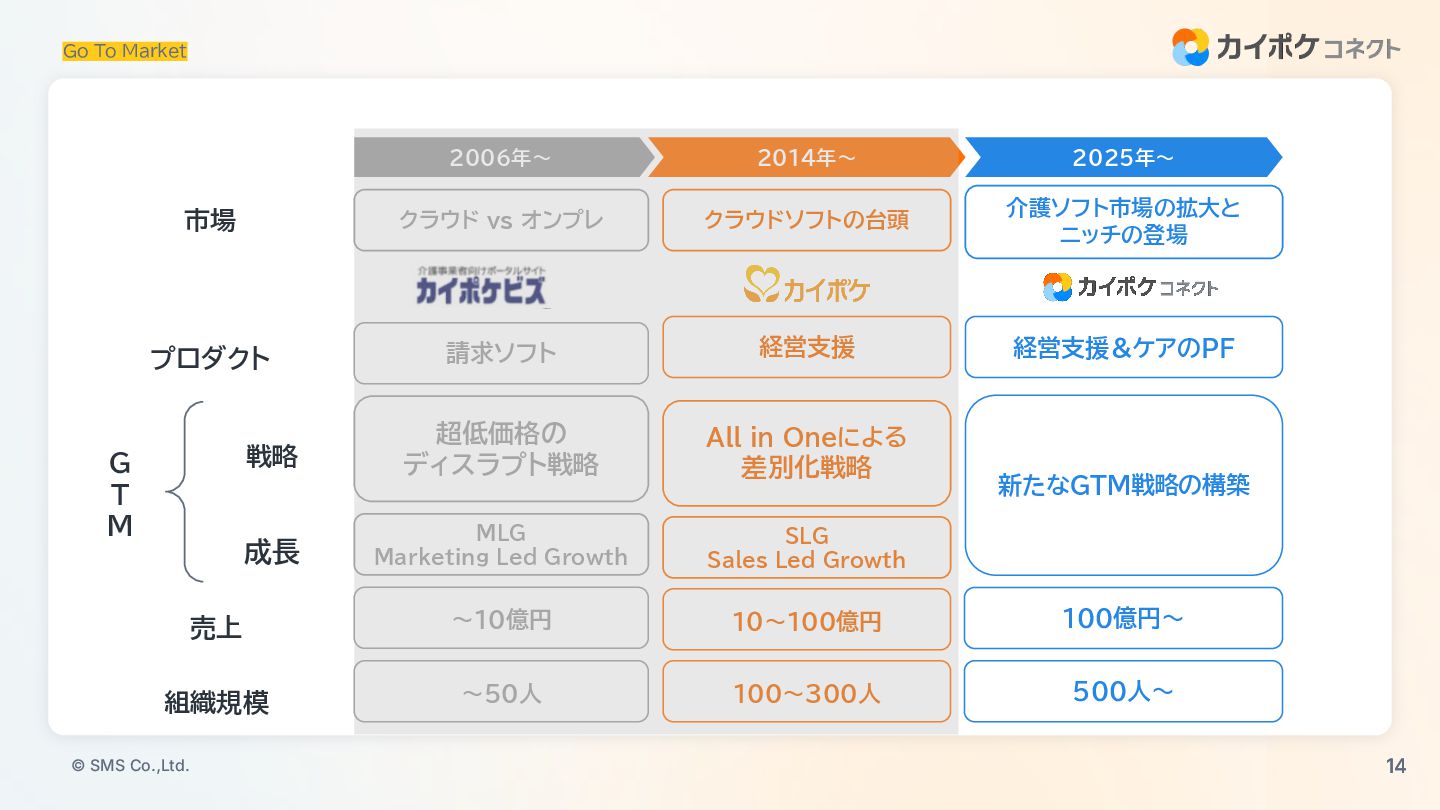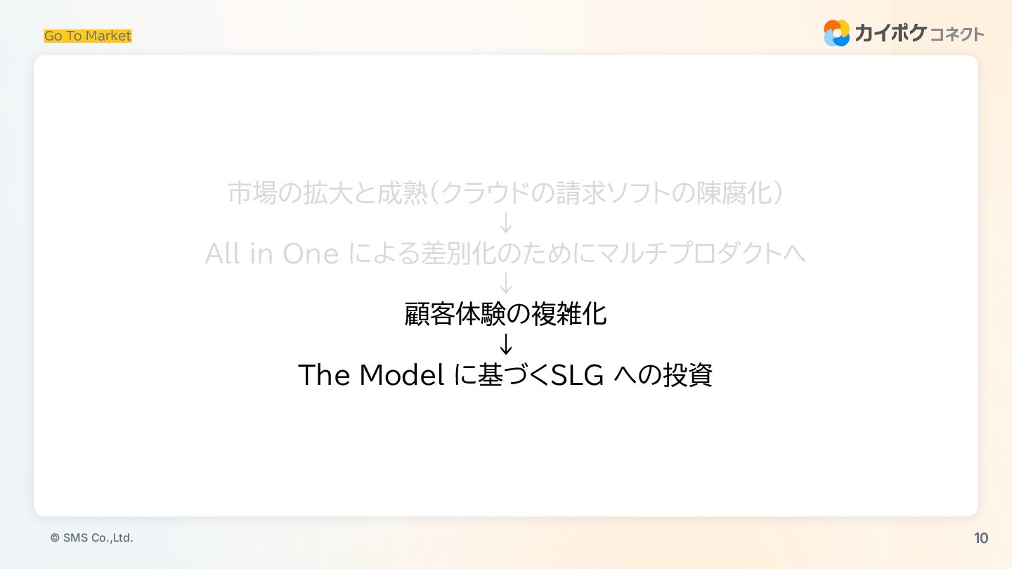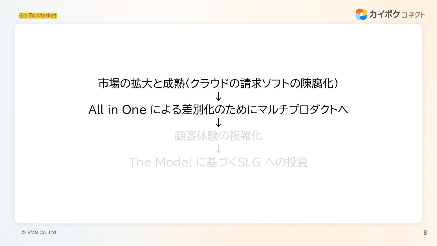 Go To Market 2014年~ 2006年~ クラウド vs オンプレ クラウドソフトの台頭 超低価格の ディスラプト戦略 All in Oneによる 差別化戦略 MLG Marketing Led Growth SLG Sales Led Growth 請求ソフト 経営支援 10~100億円 100~300人 ~10億円 ~50人 100億円~ 500人~ 市場 G T M 成長 戦略 プロダクト 組織規模 売上