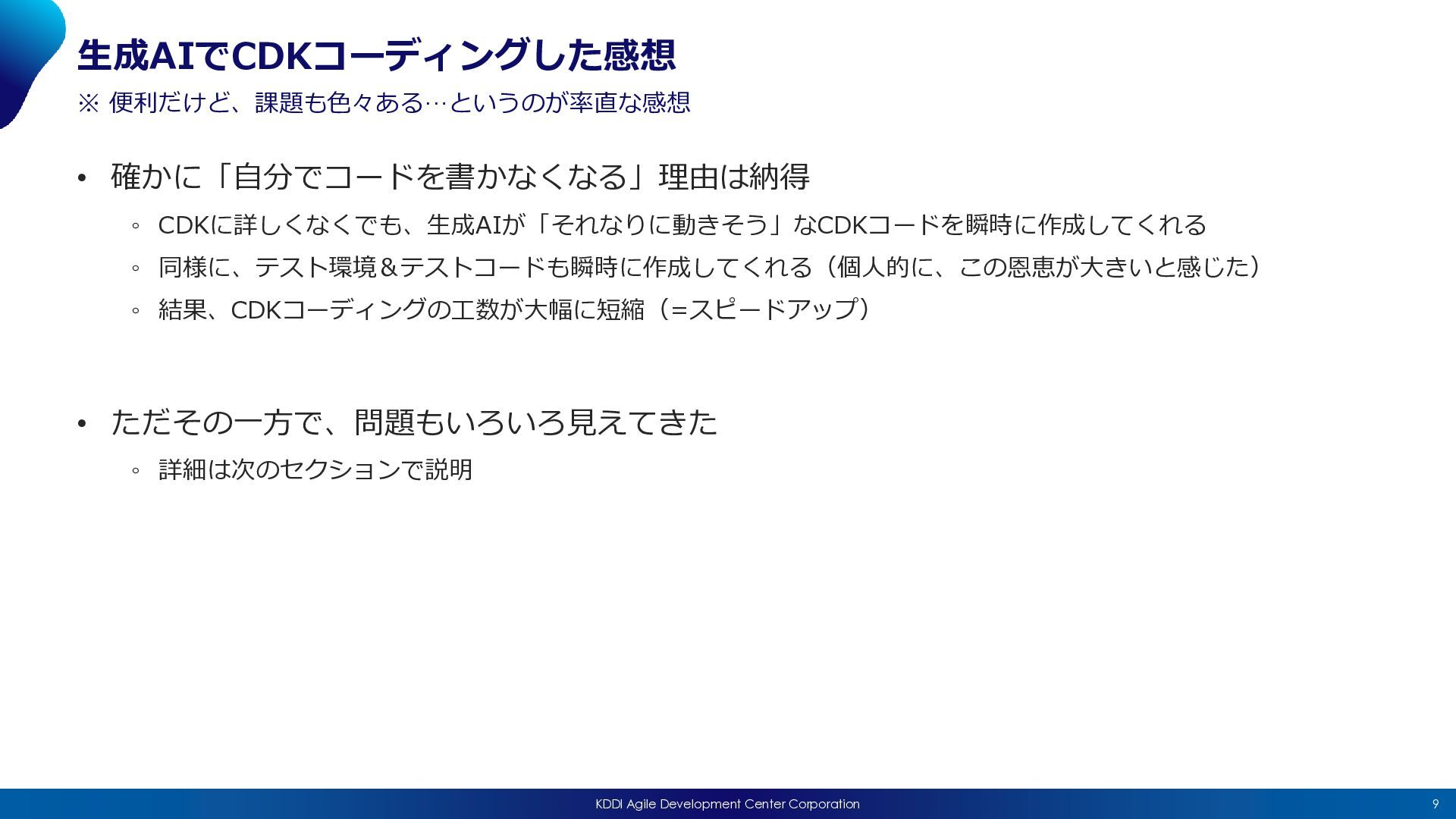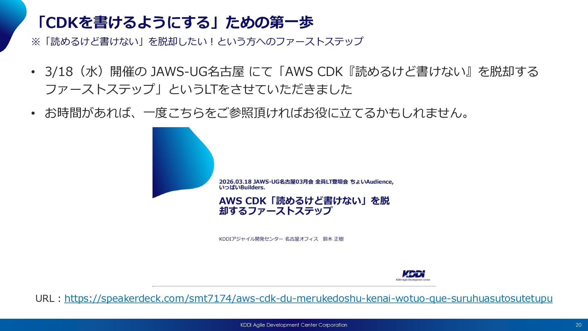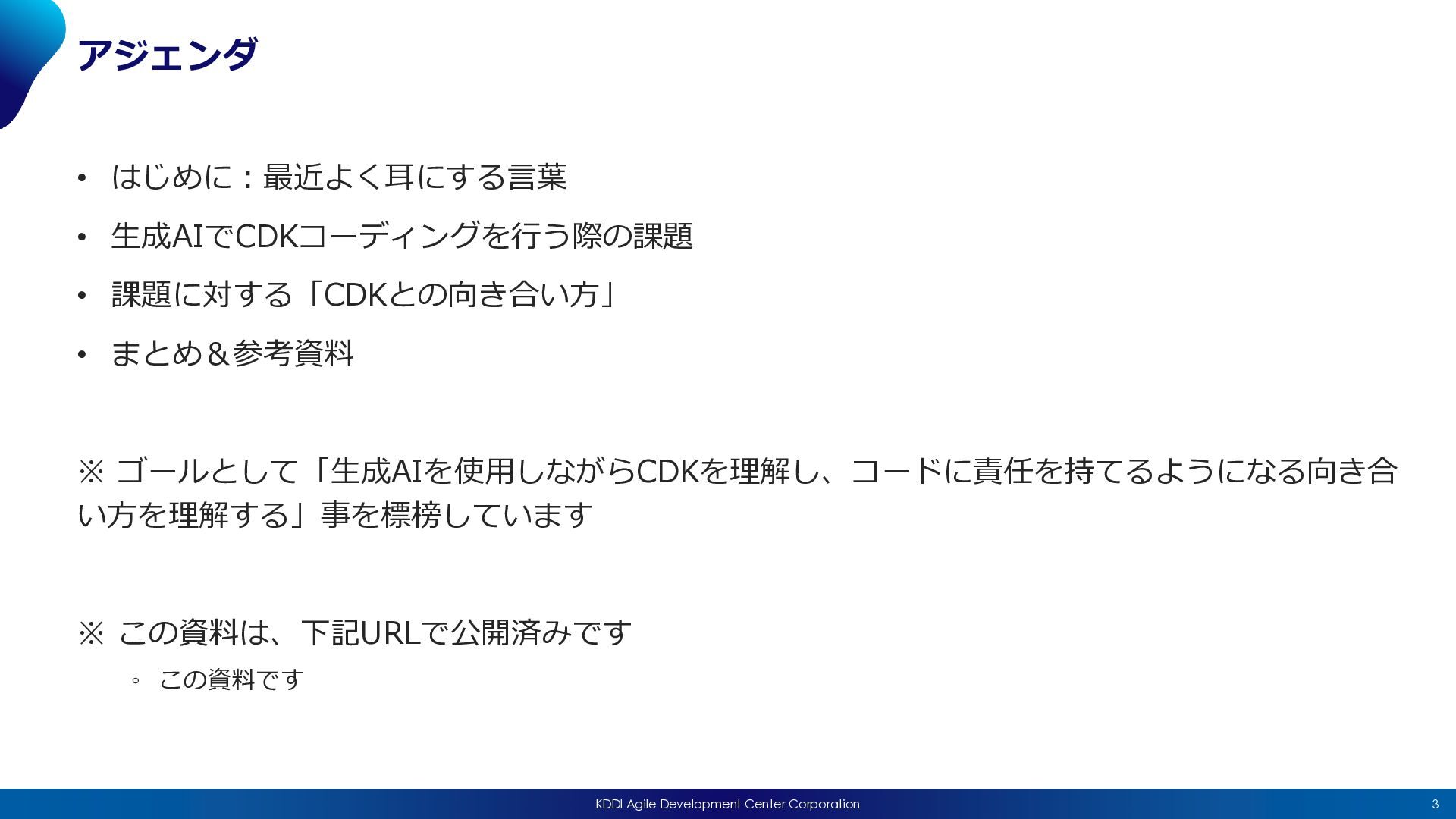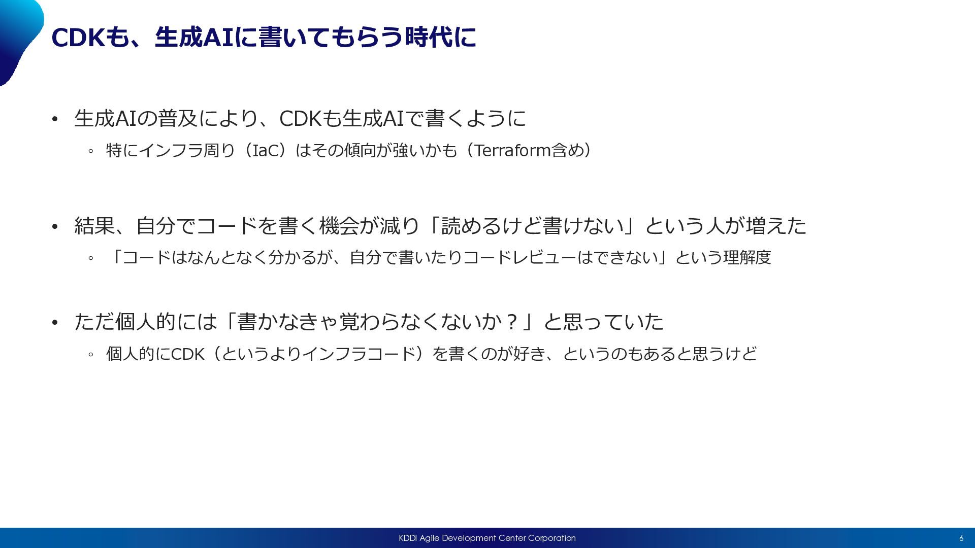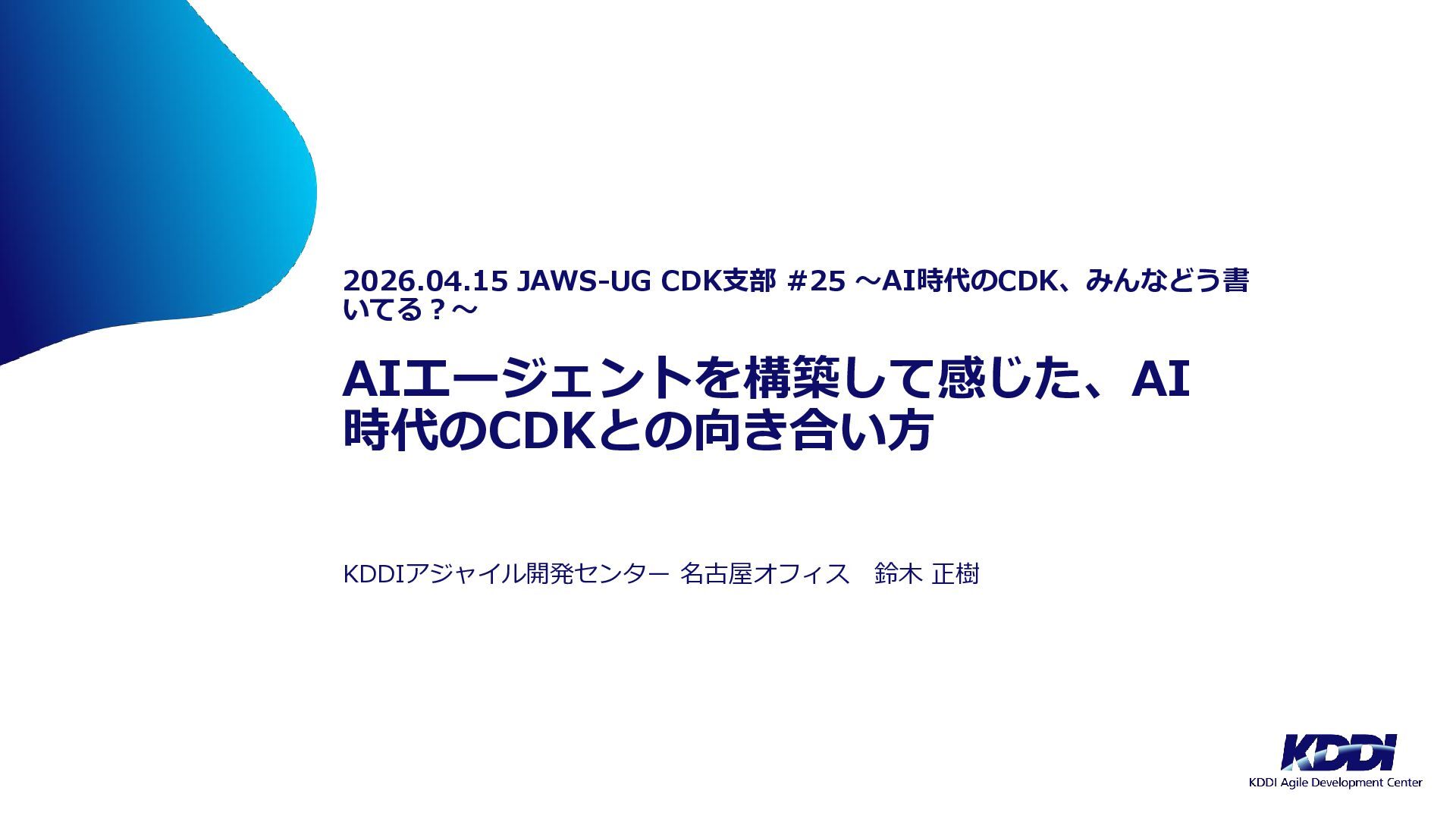 2026/04/15(水)に開催された「JAWS-UG CDK支部 #25 〜AI時代のCDK、みんなどう書いてる?〜」における私の発表「AIエージェントを構築して感じた、AI時代のCDKとの向き合い方 」の発表資料になります。