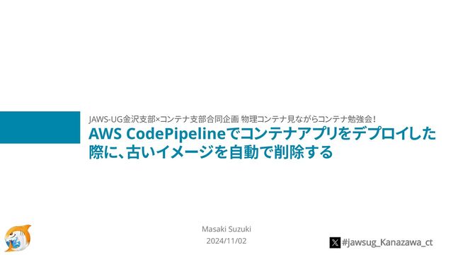 2024/11/02(土) に開催された、JAWS-UG金沢支部×コンテナ支部の合同企画イベント「物理コンテナ見ながらコンテナ勉強会!」における、私の発表「AWS CodePipelineでコンテナアプリをデプロイした際に、古いイメージを自動で削除する」の発表資料です。(connpassにも公開済みです)