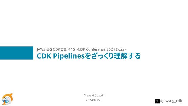 2024/09/25(水) 19:30~21:00開催の「JAWS-UG CDK支部 #16 ~CDK Conference 2024 Extra~」における私の発表「CDK Pipelinesをざっくり理解する」の発表資料になります。 https://jawsug-cdk.connpass.com/event/328676/