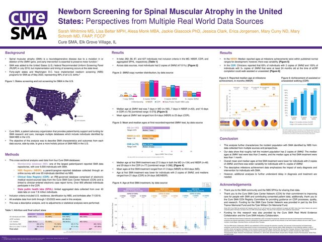 to a mutation in or deletion of the SMN1 gene, and early intervention is essential to preserve motor function.1 • SMA was added to the United States (U.S.) federal Recommended Uniform Screening Panel (RUSP) in July 2018, but implementation and timing of screening occurs at the state level. • Forty-eight states and Washington D.C. have implemented newborn screening (NBS) programs for SMA as of May 2023, representing 99% of all U.S. births.2 Figure 1: States screening and not screening for SMA in the U.S. • Cure SMA, a patient advocacy organization that provides patient/family support and funding for SMA research and care, manages multiple databases which include individuals identified by SMA NBS in the U.S. • The objective of this analysis was to describe SMA characteristics and outcomes from each data source, side-by-side, to give a more holistic picture of SMA NBS in the U.S. Newborn Screening for Spinal Muscular Atrophy in the United States: Perspectives from Multiple Real World Data Sources Sarah Whitmire MS, Lisa Belter MPH, Alesa Monk MBA, Jackie Glascock PhD, Jessica Clark, Erica Jorgensen, Mary Curry ND, Mary Schroth MD, FAAP, FCCP Cure SMA, Elk Grove Village, IL • In total, 282, 68, 87, and 427 individuals met inclusion criteria in the MD, NBSR, CDR, and aggregated SPHL, respectively. [Table 1] • Across data sources, most individuals had 2 copies of SMN2 (47-51%). [Figure 2] Figure 2: SMN2 copy number distribution, by data source • Median age at SMN1 test was 7 days in MD (n=183), 7 days in NBSR (n=63), and 10 days in CDR (n=79) [combined range: 0-373]. [Figure 3] • Mean ages at SMN1 test ranged from 8.4 days (NBSR) to 23 days (CDR). Figure 3: Mean and median ages at first recorded/reported SMN1 test, by data source • Median age at first SMA treatment was 27.5 days in both the MD (n=134) and NBSR (n=48) and 29 days in the CDR (n=77) [combined range: 0-396]. [Figure 4] • Mean ages at first SMA treatment ranged from 41.3 days (NBSR) to 49.6 days (MD). • Age at first SMA treatment was lower for individuals with 2 copies of SMN2, and medians ranged from 21 days (CDR) to 24 days (MD/NBSR). Figure 4: Age at first SMA treatment, by data source • In the NBSR: Median reported ages at milestone achievements were within published normal ranges for development; however, there was variability. [Figure 5] • In the CDR: Clinicians reported that 65% of individuals with 2 copies of SMN2 and 100% of individuals with 3+ copies of SMN2 that were at least 24 months old at the time of eCRF completion could walk assisted or unassisted. [Figure 6] • This cross-sectional analysis used data from four Cure SMA databases: • Membership database (MD): one of the largest patient/parent reported SMA data repositories, with over 9,500 individuals with SMA. • NBS Registry (NBSR): a parent/caregiver-reported database collected through an online survey with over 65 individuals identified via NBS. • Clinical Data Registry (CDR): an IRB-governed database comprised of electronic medical record-sourced data from the Cure SMA Care Center Network (CCN) and is linked to clinician-entered electronic case report forms. Over 800 affected individuals participate in the CDR. • State public health labs (SPHL): limited aggregated data collected from over 40 state labs on over 7.8 million individuals. • Inclusion criteria included U.S. residence, identification by NBS, and birthdate after 7/1/2018. • All available data from birth through 1/23/2023 were used in this analysis. • This was a descriptive analysis, and no adjustments or statistical analyses were performed. Table 1: Attrition and final cohort sizes • Thank you to the SMA community and the NBS SPHLs for sharing their data. • Thank you to the Cure SMA Care Center Network (CCN) for their commitment to improving care for people with SMA and contributing consented patient data; additionally, thank you to the Cure SMA CCN Registry Committee for providing guidance on CDR processes, quality, and research. Funding for the SMA Care Center Network was provided in part by the Erin Trainor Memorial Fund and the Tyler William Orr Memorial Fund. Since 2018, Cure SMA has partnered with hospitals across the U.S. with the goal to improve healthcare for people with SMA. Every Care Center Network site submits consented patient information and data to the Cure SMA Clinical Data Registry. This data is then analyzed to drive healthcare improvements. • Funding for this research was also provided by the Cure SMA Real World Evidence Collaboration and the Cure SMA Industry Collaboration. The Cure SMA Real World Evidence Collaboration was established in 2021 to leverage the experience, expertise and resources of pharmaceutical and biotechnology companies and nonprofit organizations involved in development of SMA therapeutics to guide the future direction of real world evidence collection and use in SMA. Current members include Biogen, Genentech/Roche, and Novartis Gene Therapies. The Cure SMA Industry Collaboration (SMA-IC) was established in 2016 to leverage the experience, expertise, and resources of pharmaceutical and biotechnology companies, as well as other nonprofit organizations involved in the development of spinal muscular atrophy (SMA) therapeutics to more effectively address a range of scientific, clinical, and regulatory challenges. Current members include Cure SMA, Biogen, Scholar Rock, Novartis Gene Therapies, Biohaven Pharmaceuticals, Epirium Bio, Genentech/Roche, and SMA Europe. Funding for this research was provided by members of the 2018 to 2023 SMA-IC; members included Cure SMA, Astellas Pharmaceuticals, Biogen, Biohaven Pharmaceuticals, Cytokinetics Inc., Epirium Bio, Genentech/Roche, Novartis Gene Therapies, Novartis Pharmaceuticals, Scholar Rock, and SMA Europe. • This analysis further characterizes the incident population with SMA identified by NBS from data collected from multiple sources and perspectives. • Our data show 