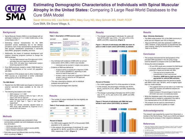 from 2019 to 2021 was +0.5%, +1%, and +2.3% in OC, aEMR, and ORD, respectively. [Figure 1] Figure 1. Percent of individuals with SMA that were 18 years or older in each cohort (2019-2022), by dataset Percent of Females • Our model suggests that 51% of the population is female. • In this analysis, the percentage of females was 49.5%, 80.4%, and 52.5% in OC, aEMR, and ORD, respectively, in 2021. • The change in percentage of females from 2019 to 2021 was +0.1%, +2.1%, and +0.2% in OC, aEMR, and ORD, respectively. Figure 2. Percent of individuals with SMA that were female in each cohort (2019-2022), by dataset • Spinal Muscular Atrophy (SMA) is a rare disease with an estimated incidence of 1 in 11,000-15,000 births in the United States (US).1,2 • Estimating national characteristics for the SMA population proves challenging due to low disease prevalence, lack of fully representative standardized US data sources, classification complexities in real-world data (RWD), geographic variability, and more. • Additionally, the impact of treatment development and newborn screening programs continue to change the SMA landscape. • The first SMA treatment was FDA-approved in 2016, and today there are 3 approved treatments. • Since 2018, 48 states have implemented newborn screening programs for SMA. • Cure SMA previously created a model (“SMA Model”) to estimate characteristics of the current US population with SMA. • The objective of this analysis was to utilize multiple large RWD sources as a benchmark to further understand demographics of the US SMA population. The SMA Model • Results from the SMA model were based on internal and external real-world inputs available at the time of creation. • The following assumptions were made: • SMA incidence 1 in 11,0001 • SMA subtype incidence of 60% for Type 1, 30% for Type 2, and 10% for Type 3/41 • Median age of survival of 4 years, 40 years, and 78 years for SMA Type 1, Type 2, and Type 3, respectively2 • Race and ethnicity estimates adjusted based on SMA carrier rates described by Sugarman et al.3; and the 2010 US Census4 Estimating Demographic Characteristics of Individuals with Spinal Muscular Atrophy in the United States: Comparing 3 Large Real-World Databases to the Cure SMA Model Sarah Whitmire MS, Lisa Belter MPH, Mary Curry ND, Mary Schroth MD, FAAP, FCCP Cure SMA, Elk Grove Village, IL Table 1. Description of RWD sources used • Any individual with evidence of SMA within an annual cross-section (2019, 2020, or 2021) was included. • Individuals can be counted in multiple cross-sections • Evidence of SMA was defined as: • At least 2 claims or records with a diagnosis of SMA (ICD-10-CM or SNOMED-CT, depending on data source) at least 30 days apart, or • At least 1 claim or record with a diagnosis of SMA and at least 1 claim or record for an FDA approved treatment for SMA. • This was a descriptive analysis, and no statistical analyses were performed. • Counts and percentages were reported. Race / Ethnicity Distribution • The SMA model predicts 70% of the SMA community is white and non-Hispanic and 16% is Hispanic. • Race and ethnicity were also assessed in aEMR and ORD. However, a high proportion of race/ethnicity data were missing, making the results difficult to interpret. Data is not shown. This research was supported by a grant from Genentech, a member of the Roche Group. Thank you to IQVIA and Optum for executing the analyses in their respective databases. • This analysis characterized the demographics of the prevalent SMA population in the US using 3 large external datasets to compare to the Cure SMA Model. • Among the external datasets: • OC and ORD results were consistent the SMA Model. • In contrast, aEMR showed a substantially higher proportion of adults and females with SMA. • This may be due to baseline data characteristics or how it was sourced. • Therefore, aEMR data by itself may not be appropriate for national SMA estimates. • The OC and ORD datasets show the percent of adults with SMA in 2021 was ~60-62%, which is slightly higher than our model estimate. • This suggests that the survival rates in our model may need to be revisited, and additional analyses are needed to confirm. • Subtle increases in the percentages of adults from 2019-2021 were seen (not statistically tested). • While the databases used in this analysis are large, additional work is needed to understand if the data is truly representative of the US SMA community. • This analysis can be used as a benchmark or comparison as we work to update our model. Conclusion Acknowledgements DATASET SOURCE SIZE IQVIA open claims (OC) Pre-adjudicated claims from office management software and clearinghouse switch sources for reimbursement >817 million individuals from 2000 - present IQVIA ambulatory electronic medical records (aEMR) Electronic medical records from primary and specialty office-based visits >83 million individuals from 2006 - present Optum Research Database (ORD) Adjudicated administrative medical and pharmacy claims from a large insurer > 90 million individuals from 1993 - present 59.6% 84.5% 59.7% 57.0% 59.7% 86.5% 61.2% 60.1% 85.5% 62.0% 0% 10% 20% 30% 40% 50% 60% 70% 80% 90% 100% SMA Model IQVIA Open Claims IQVIA aEMR Optum Claims 2019 n=6280 2020 n=6170 2021 n=6491 2019 n=516 2020 n=587 2021 n=423 2019 n=449 2020 n=435 2021 n=432 49.4% 78.3% 52.3% 51.0% 49.5% 82.6% 55.6% 49.5% 80.4% 52.6% 0% 10% 20% 30% 40% 50% 60% 70% 80% 90% 100% SMA Model IQVIA Open Claims IQVIA aEMR Optum Claims 2019 n=6278 2020 n=6167 2021 n=6489 2019 n=516 2020 n=587 2021 n=423 2019 n=449 2020 n=435 2021 n=432 Results • The number of unique individuals that met eligibility are reported in Table 2. Table 2. Final sample sizes in each cross-section Percent of Adults • Our SMA model suggests that 57% of the prevalent SMA population is 18+ years old. • In this analysis, the percentage of individuals 18+ years old was 60