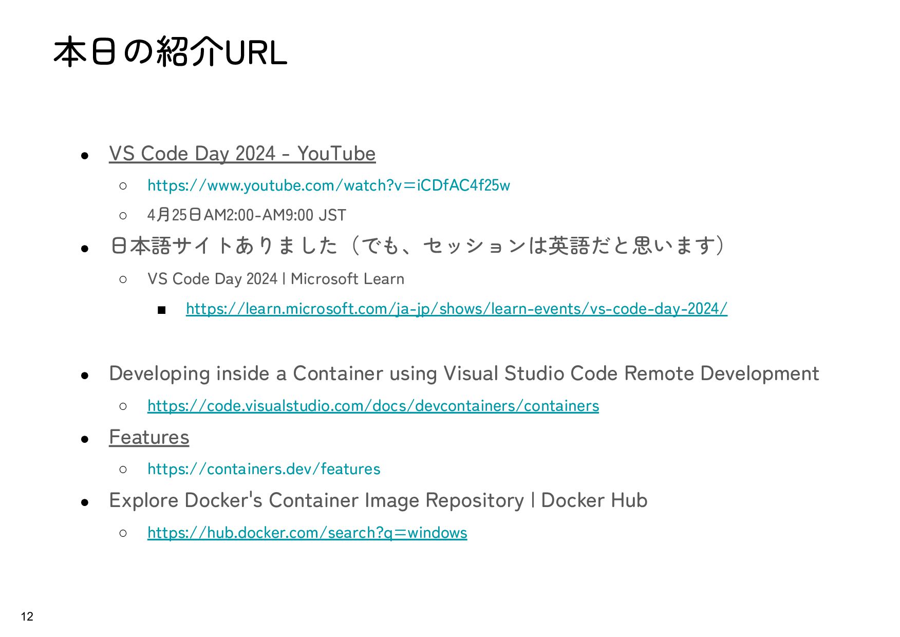 https://www.youtube.com/watch?v=iCDfAC4f25w ◦ 4月25日AM2:00-AM9:00 JST • 日本語サイトありました(でも、セッションは英語だと思います) ◦ VS Code Day 2024 | Microsoft Learn ▪ https://learn.microsoft.com/ja-jp/shows/learn-events/vs-code-day-2024/ • Developing inside a Container using Visual Studio Code Remote Development ◦ https://code.visualstudio.com/docs/devcontainers/containers • Features ◦ https://containers.dev/features • Explore Docker's Container Image Repository | Docker Hub ◦ https://hub.docker.com/search?q=windows