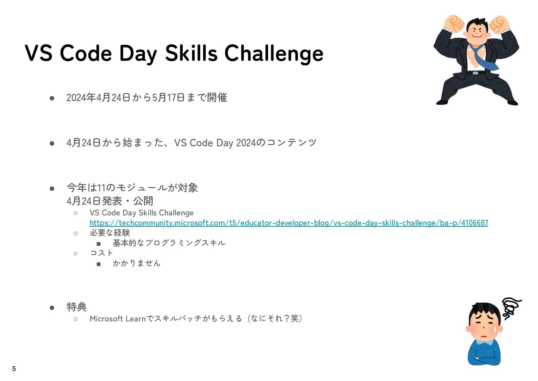 5 VS Code Day Skills Challenge • 2024年4月24日から5月17日まで開催 • 4月24日から始まった、VS