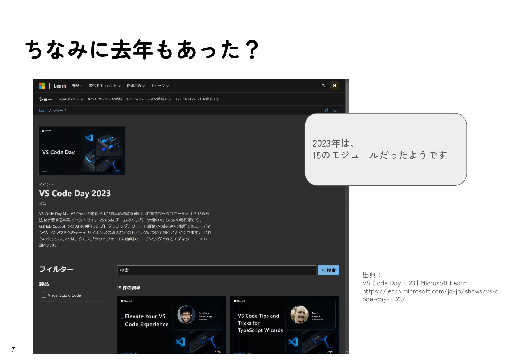 7 ちなみに去年もあった? 出典: VS Code Day 2023 | Microsoft Learn