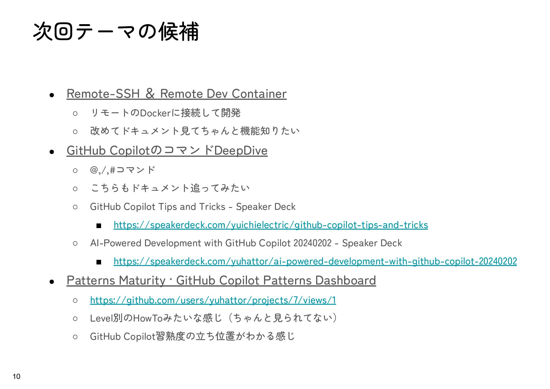 ◦ 改めてドキュメント見てちゃんと機能知りたい • GitHub CopilotのコマンドDeepDive ◦ @,/,#コマンド ◦ こちらもドキュメント追ってみたい ◦ GitHub Copilot Tips and Tricks - Speaker Deck ▪ https://speakerdeck.com/yuichielectric/github-copilot-tips-and-tricks ◦ AI-Powered Development with GitHub Copilot 20240202 - Speaker Deck ▪ https://speakerdeck.com/yuhattor/ai-powered-development-with-github-copilot-20240202 • Patterns Maturity · GitHub Copilot Patterns Dashboard ◦ https://github.com/users/yuhattor/projects/7/views/1 ◦ Level別のHowToみたいな感じ(ちゃんと見られてない) ◦ GitHub Copilot習熟度の立ち位置がわかる感じ