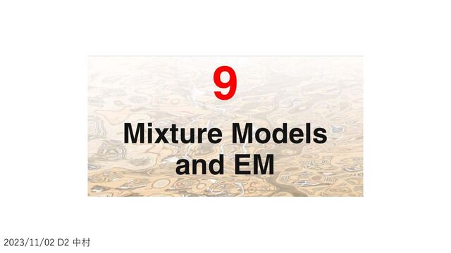 𝚺𝑘 = ς 𝑘′=1 𝐾 𝜋𝑘′ 𝒩 𝐱𝑛 𝝁𝑘′ , 𝚺𝑘′ 𝑧 𝑛𝑘′ σ𝐳𝒏 [𝜋𝑘 𝒩 𝐱𝑛 𝝁𝑘 , 𝚺𝑘 ]𝑧𝑛𝑘 … … 𝐳𝑛 = 𝑧𝑛1 , 𝑧𝑛2 , … 𝑧𝑛𝑘 , … 𝑧𝑛𝐾 𝑝 𝑧𝑛𝑘 = ෑ 𝑘=1 𝐾 𝜋 𝑘 𝑧𝑛𝑘 Σ𝐳𝑛 は、考え得る 𝐳𝒏 すべてについての 和を表している。 𝑧𝑛1 = 1 1,0, … 0, … 0 𝑧𝑛2 = 1 0,1, … 0, … 0 𝑧𝑛𝑘 = 1 0,0, … 1, … 0 𝑧𝑛𝐾 = 1 (0,0, … 0, … 1) K (9.40) 𝔼𝐳𝑛|𝐱𝑛,𝝁𝑘,𝚺𝑘 𝑧𝑛𝑘 = 𝐳𝑛 𝑧𝑛𝑘 𝑝(𝐳𝑛 𝐱𝑛 , 𝝁𝑘 , 𝚺𝑘 = σ𝐳𝑛 𝑧𝑛𝑘 ς 𝑘′=1 𝐾 𝜋𝑘′ 𝒩 𝐱𝑛 𝝁𝑘′ , 𝚺𝑘′ 𝑧 𝑛𝑘′ σ𝐳𝒏 ς 𝑗=1 𝐾 [𝜋𝑗 𝒩 𝐱𝑛 𝝁𝑗 , 𝚺𝑗 ]𝑧𝑛𝑗 = 0 × 𝜋1 𝒩 𝐱𝑛 𝝁1 , 𝚺1 + ⋯ + 1 × 𝜋𝑘 𝒩 𝐱𝑛 𝝁𝑘 , 𝚺𝑘 + ⋯ 0 × 𝜋𝐾 𝒩 𝐱𝑛 𝝁𝐾 , 𝚺𝐾 𝜋1 𝒩 𝐱𝑛 𝝁1 , 𝚺1 + ⋯ + 𝜋𝐾 𝒩 𝐱𝑛 𝝁𝐾 , 𝚺𝐾 ≡ 𝛾 𝑧𝑛𝑘 34/56