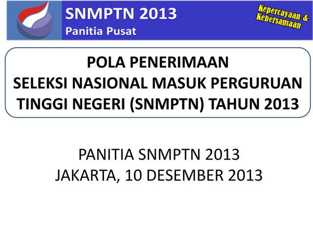 mengirim data prestasi siswa ke PDSS-SNMPTN. Akreditasi sekolah menentukan jumlah siswa yg boleh mendaftar. SNMPTN 2013 Peserta tidak dikenai biaya pendaftaran. Wajib mengirim data prestasi siswa semua semester ke PDSS-SNMPTN. Akreditasi sekolah Tidak menentukan jumlah siswa yg boleh mendaftar. PERBEDAAN SNMPTN JALUR UNDANGAN 2012 DENGAN SNMPTN 2013