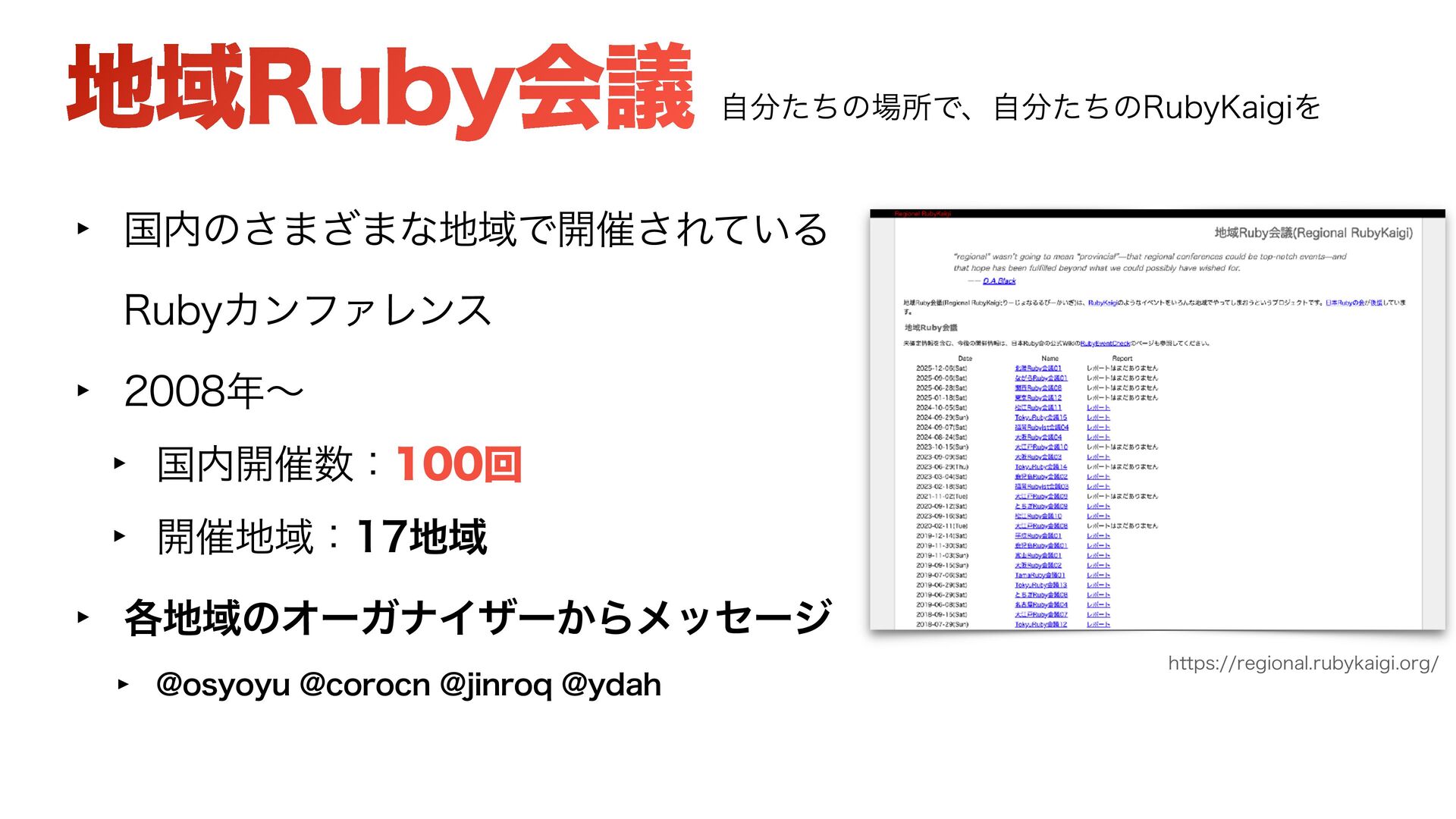 Ҭ3VCZձٞ ‣ ࠃͷ͞·͟·ͳҬͰ։࠵͞Ε͍ͯΔ 3VCZΧϯϑΝϨϯε ‣ ʙ ‣ ࠃ։࠵ɿճ ‣ ։࠵ҬɿҬ