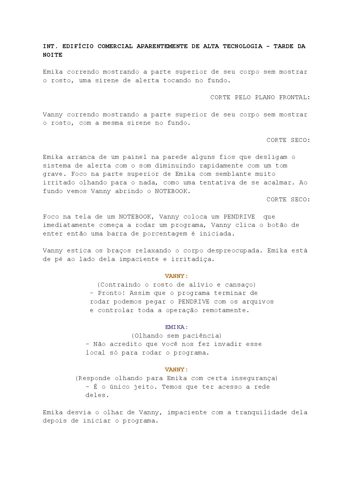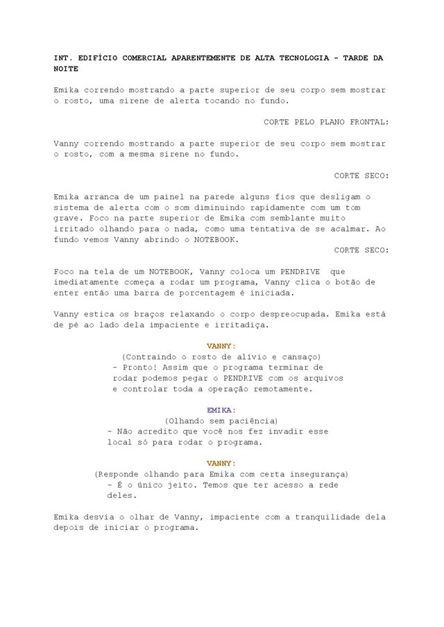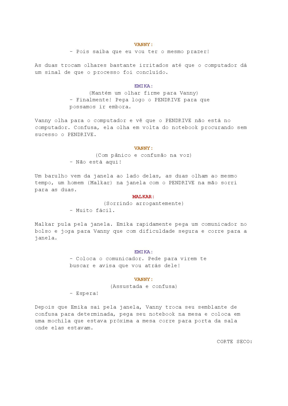 prazer! As duas trocam olhares bastante irritados até que o computador dá um sinal de que o processo foi concluído. EMIKA: (Mantém um olhar firme para Vanny) - Finalmente! Pega logo o PENDRIVE para que possamos ir embora. Vanny olha para o computador e vê que o PENDRIVE não está no computador. Confusa, ela olha em volta do notebook procurando sem sucesso o PENDRIVE. VANNY: (Com pânico e confusão na voz) - Não está aqui! Um barulho vem da janela ao lado delas, as duas olham ao mesmo tempo, um homem (Malkar) na janela com o PENDRIVE na mão sorri para as duas. MALKAR: (Sorrindo arrogantemente) - Muito fácil. Malkar pula pela janela. Emika rapidamente pega um comunicador no bolso e joga para Vanny que com dificuldade segura e corre para a janela. EMIKA: - Coloca o comunicador. Pede para virem te buscar e avisa que vou atrás dele! VANNY: (Assustada e confusa) - Espera! Depois que Emika sai pela janela, Vanny troca seu semblante de confusa para determinada, pega seu notebook na mesa e coloca em uma mochila que estava próxima a mesa corre para porta da sala onde elas estavam. CORTE SECO: