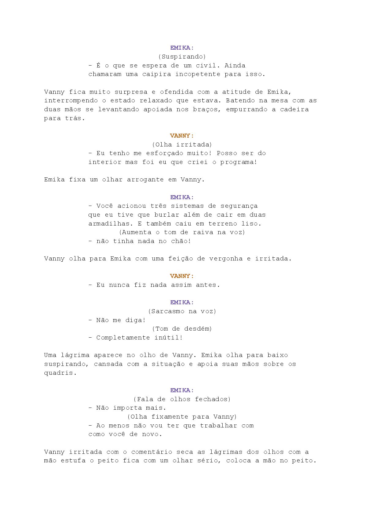 civil. Ainda chamaram uma caipira incopetente para isso. Vanny fica muito surpresa e ofendida com a atitude de Emika, interrompendo o estado relaxado que estava. Batendo na mesa com as duas mãos se levantando apoiada nos braços, empurrando a cadeira para trás. VANNY: (Olha irritada) - Eu tenho me esforçado muito! Posso ser do interior mas foi eu que criei o programa! Emika fixa um olhar arrogante em Vanny. EMIKA: - Você acionou três sistemas de segurança que eu tive que burlar além de cair em duas armadilhas. E também caiu em terreno liso. (Aumenta o tom de raiva na voz) - não tinha nada no chão! Vanny olha para Emika com uma feição de vergonha e irritada. VANNY: - Eu nunca fiz nada assim antes. EMIKA: (Sarcasmo na voz) - Não me diga! (Tom de desdém) - Completamente inútil! Uma lágrima aparece no olho de Vanny. Emika olha para baixo suspirando, cansada com a situação e apoia suas mãos sobre os quadris. EMIKA: (Fala de olhos fechados) - Não importa mais. (Olha fixamente para Vanny) - Ao menos não vou ter que trabalhar com como você de novo. Vanny irritada com o comentário seca as lágrimas dos olhos com a mão estufa o peito fica com um olhar sério, coloca a mão no peito.