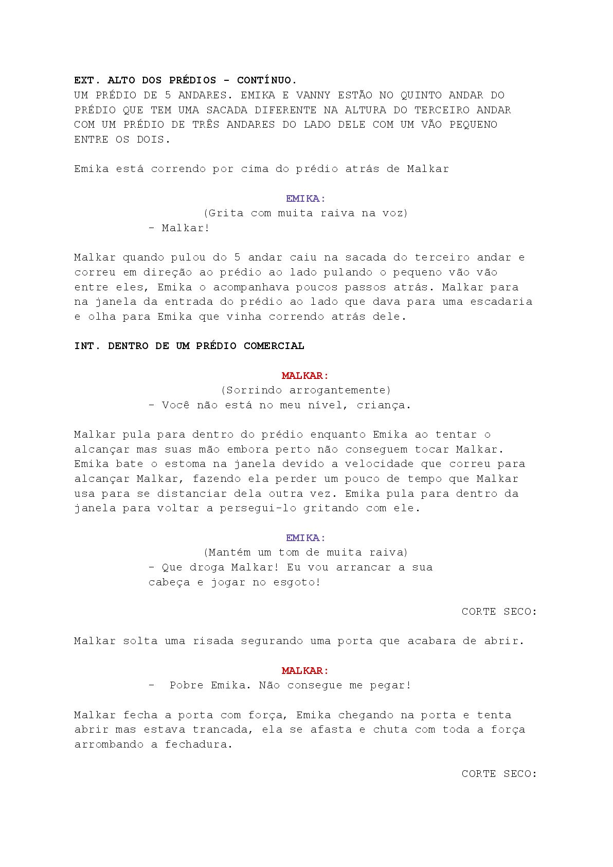 ANDARES. EMIKA E VANNY ESTÃO NO QUINTO ANDAR DO PRÉDIO QUE TEM UMA SACADA DIFERENTE NA ALTURA DO TERCEIRO ANDAR COM UM PRÉDIO DE TRÊS ANDARES DO LADO DELE COM UM VÃO PEQUENO ENTRE OS DOIS. Emika está correndo por cima do prédio atrás de Malkar EMIKA: (Grita com muita raiva na voz) - Malkar! Malkar quando pulou do 5 andar caiu na sacada do terceiro andar e correu em direção ao prédio ao lado pulando o pequeno vão vão entre eles, Emika o acompanhava poucos passos atrás. Malkar para na janela da entrada do prédio ao lado que dava para uma escadaria e olha para Emika que vinha correndo atrás dele. INT. DENTRO DE UM PRÉDIO COMERCIAL MALKAR: (Sorrindo arrogantemente) - Você não está no meu nível, criança. Malkar pula para dentro do prédio enquanto Emika ao tentar o alcançar mas suas mão embora perto não conseguem tocar Malkar. Emika bate o estoma na janela devido a velocidade que correu para alcançar Malkar, fazendo ela perder um pouco de tempo que Malkar usa para se distanciar dela outra vez. Emika pula para dentro da janela para voltar a persegui-lo gritando com ele. EMIKA: (Mantém um tom de muita raiva) - Que droga Malkar! Eu vou arrancar a sua cabeça e jogar no esgoto! CORTE SECO: Malkar solta uma risada segurando uma porta que acabara de abrir. MALKAR: - Pobre Emika. Não consegue me pegar! Malkar fecha a porta com força, Emika chegando na porta e tenta abrir mas estava trancada, ela se afasta e chuta com toda a força arrombando a fechadura. CORTE SECO: