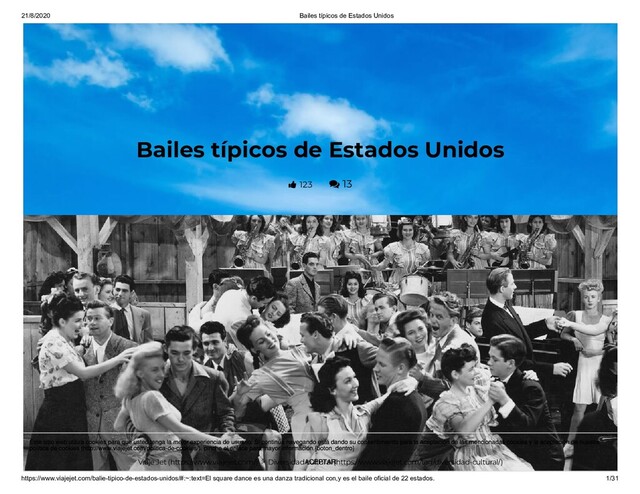 una danza tradicional con,y es el baile oficial de 22 estados. 3/31 1. Country Este estilo musical, también conocido como country and western o música campirana, es una combinación de música folklórica de las Islas Británicas con música afroamericana como el blues y el gospel. Sus orígenes se sitúan en el siglo XVIII, en las regiones rurales del sur de Estados Unidos. Ya en el siglo XIX comenzaron a construirse salas de baile en las grandes granjas. En las casas más pequeñas, se bailaba en la cocina. Es en los años veinte cuando nace el country comercializado, tal y como lo conocemos hoy en día. El country tradicional es interpretado por instrumentos de cuerda (banjo, guitarra, violín y contrabajo), mientras que en el moderno se introducen otros instrumentos como la guitarra eléctrica. estados- unidos/&via=viajejet&lang=es) Este sitio web utiliza cookies para que usted tenga la mejor experiencia de usuario. Si continúa navegando está dando su consentimiento para la aceptación de las mencionadas cookies y la aceptación de nuestra política de cookies (http://www.viajejet.com/politica-de-cookies/), pinche el enlace para mayor información.{boton_dentro} ACEPTAR