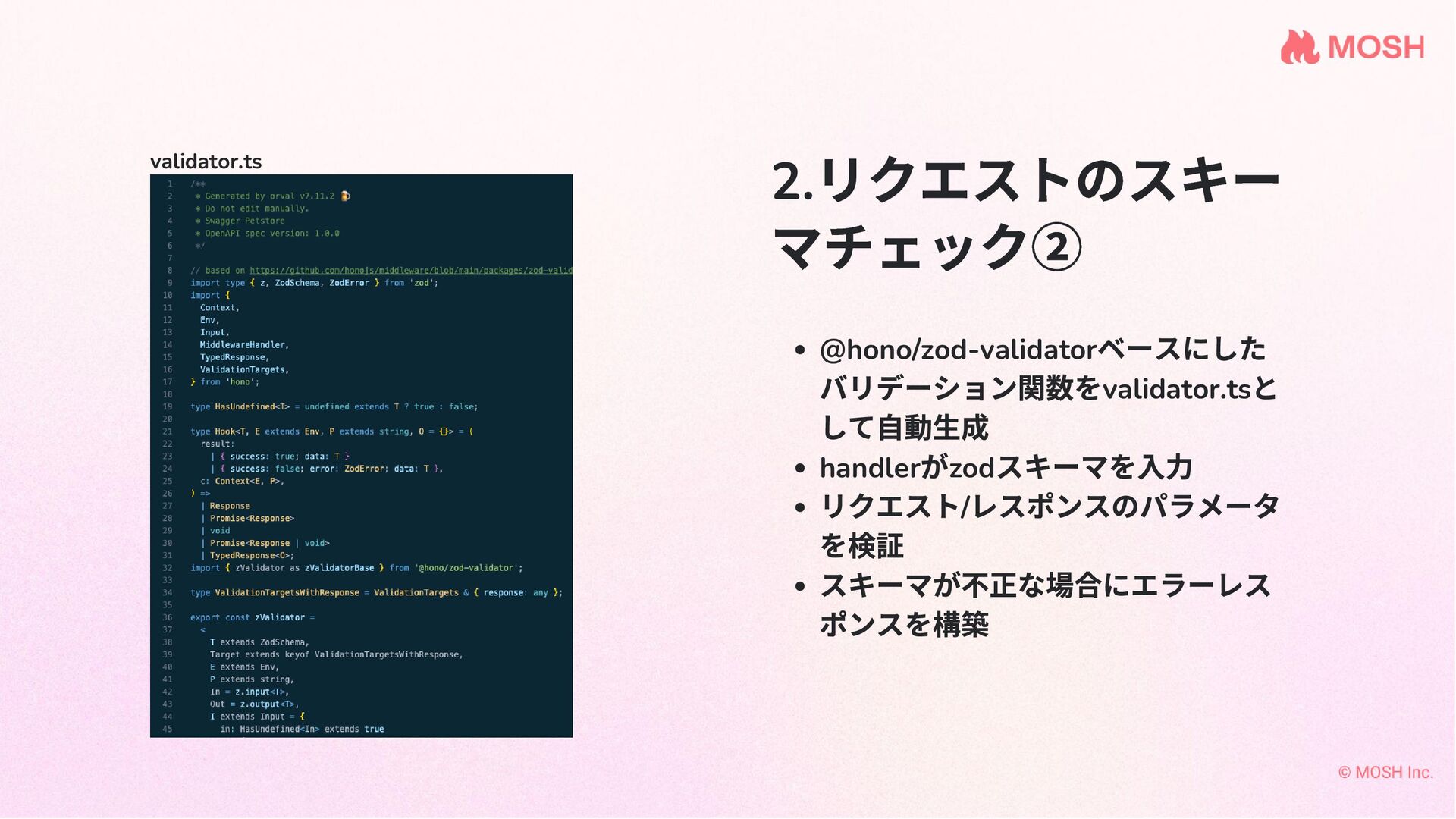 スキーマを入力 リクエスト/ レスポンスのパラメータ を検証 スキーマが不正な場合にエラーレス ポンスを構築 validator.ts