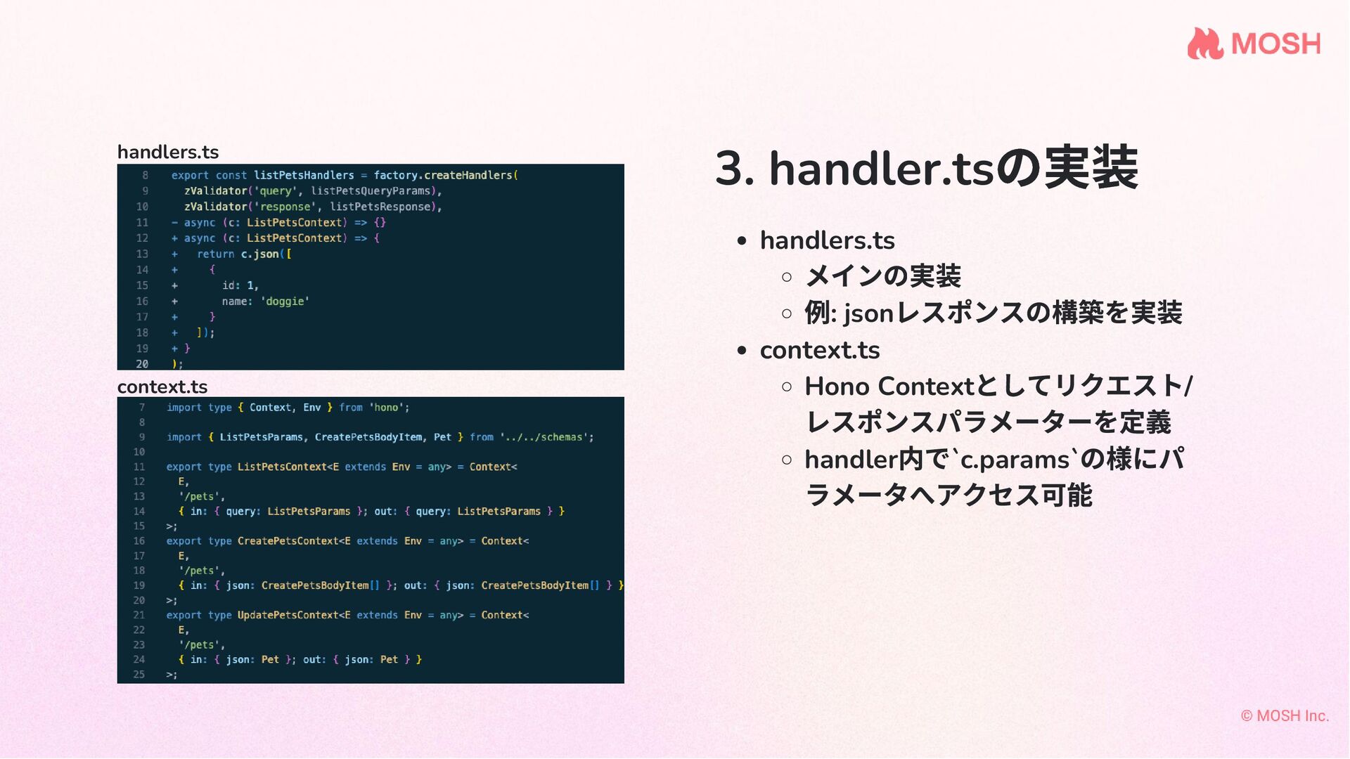 3. handler.ts の実装 handlers.ts メインの実装 例: json レスポンスの構築を実装 context.ts Hono