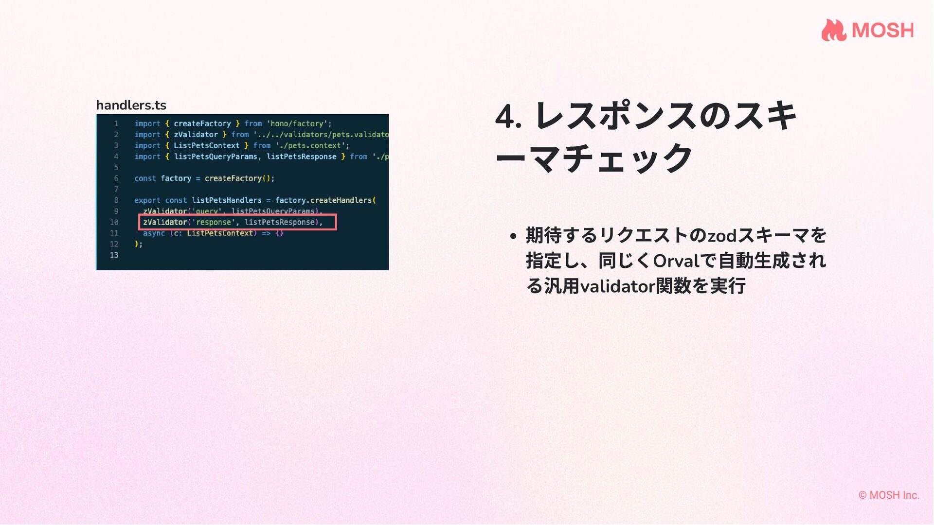 4. レスポンスのスキ ーマチェック 期待するリクエストのzod スキーマを 指定し、同じくOrval で自動生成され る汎用validator 関数を実行 handlers.ts