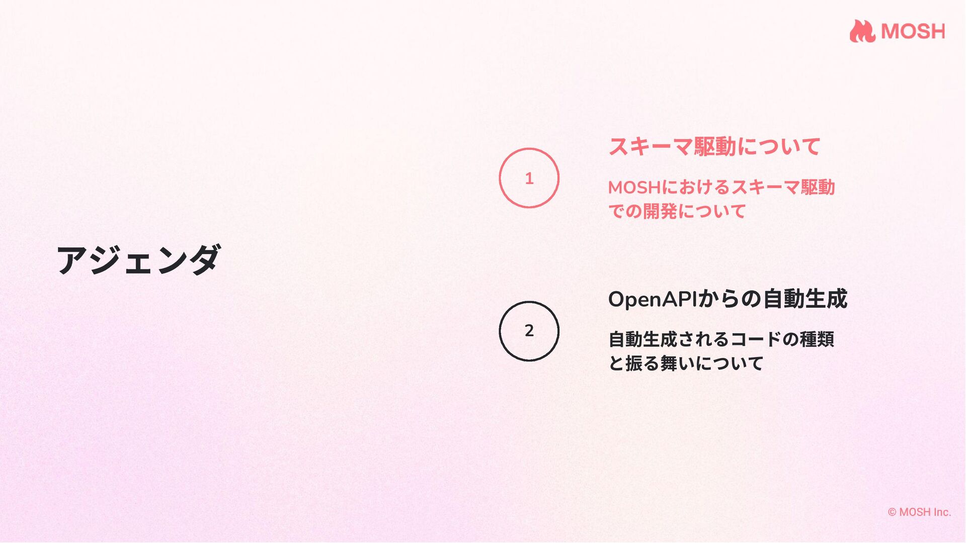 アジェンダ MOSH におけるスキーマ駆動 での開発について スキーマ駆動について 自動生成されるコードの種類 と振る舞いについて OpenAPI からの自動生成 1