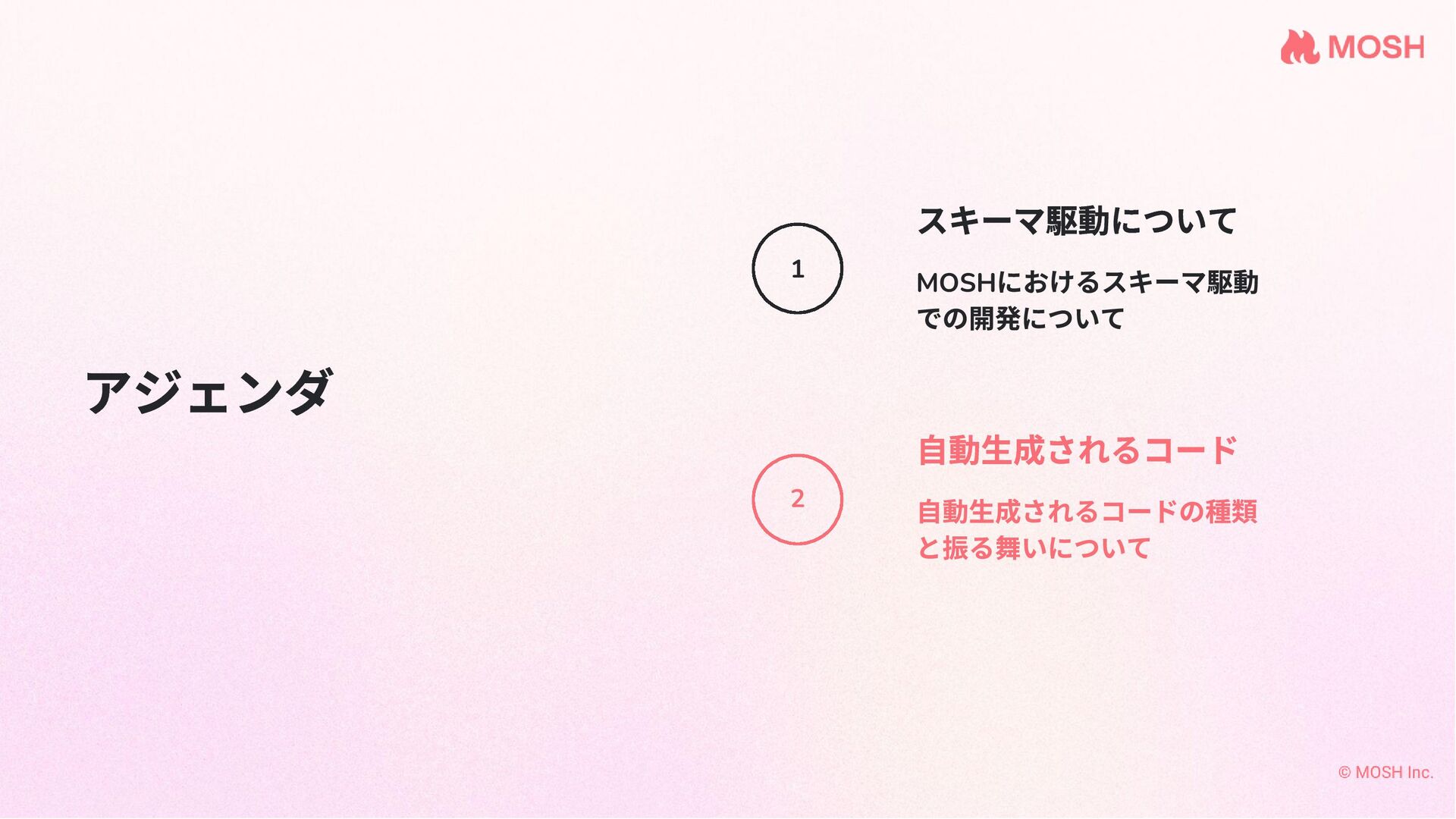 アジェンダ MOSH におけるスキーマ駆動 での開発について スキーマ駆動について 自動生成されるコードの種類 と振る舞いについて 自動生成されるコード 1 2