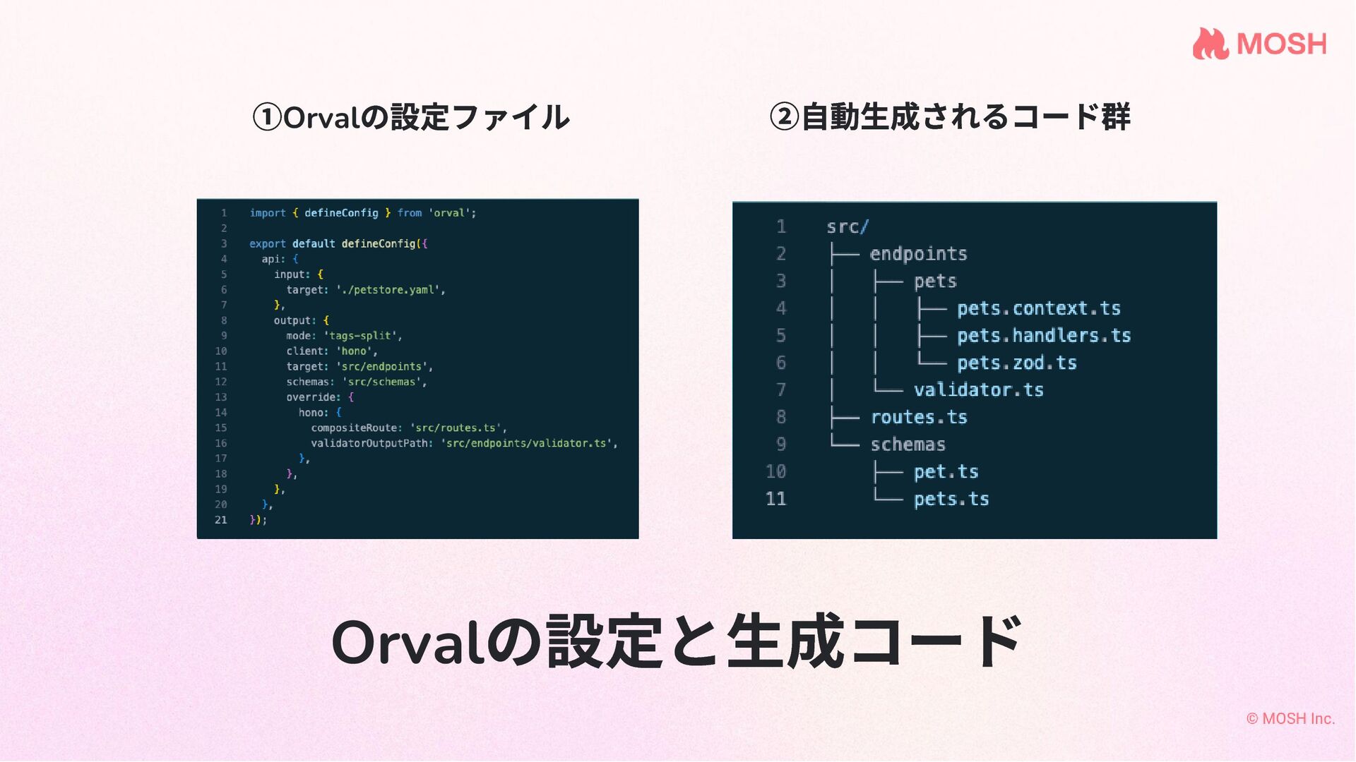 ①Orval の設定ファイル ②自動生成されるコード群 Orval の設定と生成コード