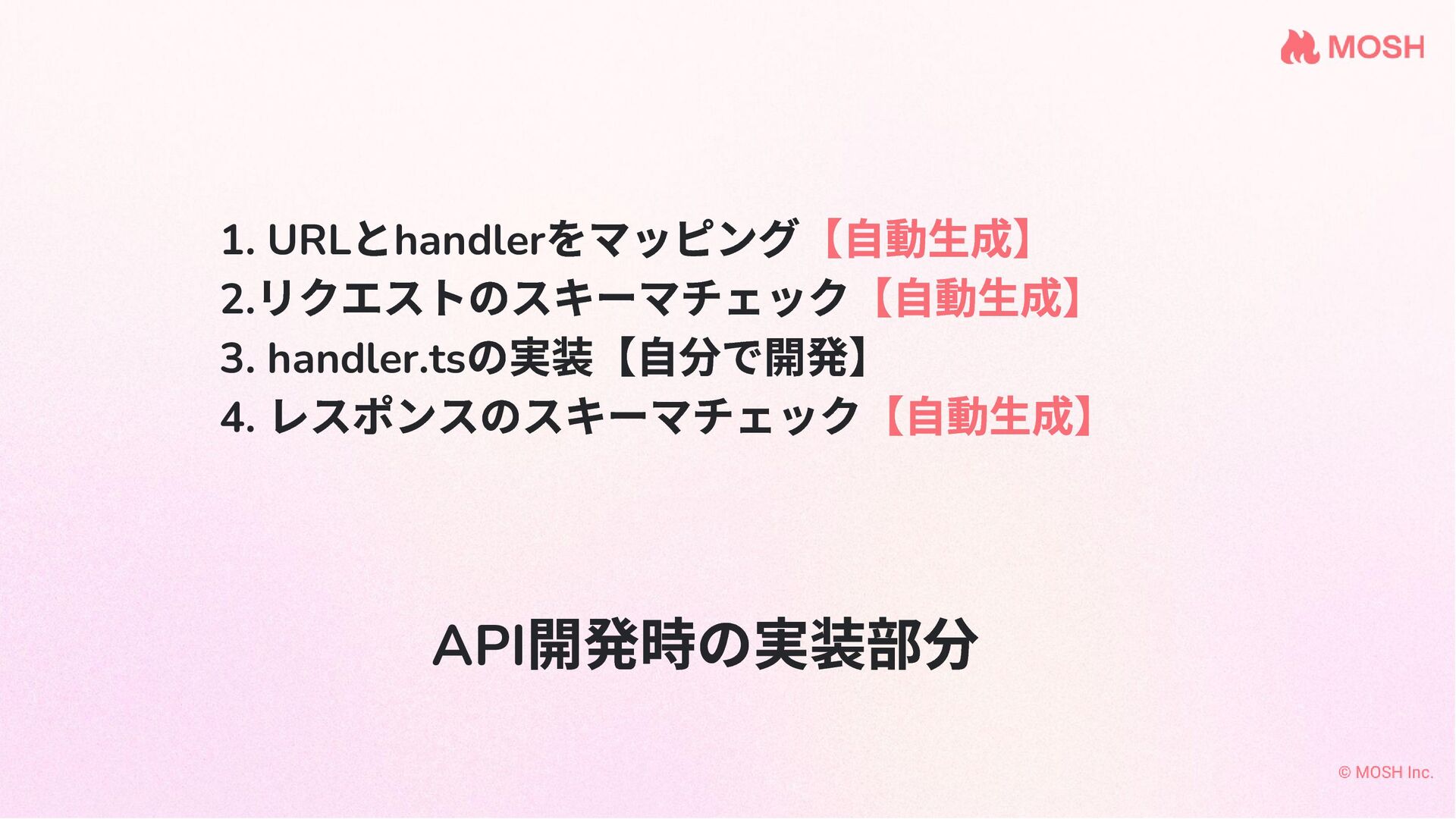 API 開発時の実装部分 1. URL とhandler をマッピング【自動生成】 2. リクエストのスキーマチェック【自動生成】 3. handler.ts