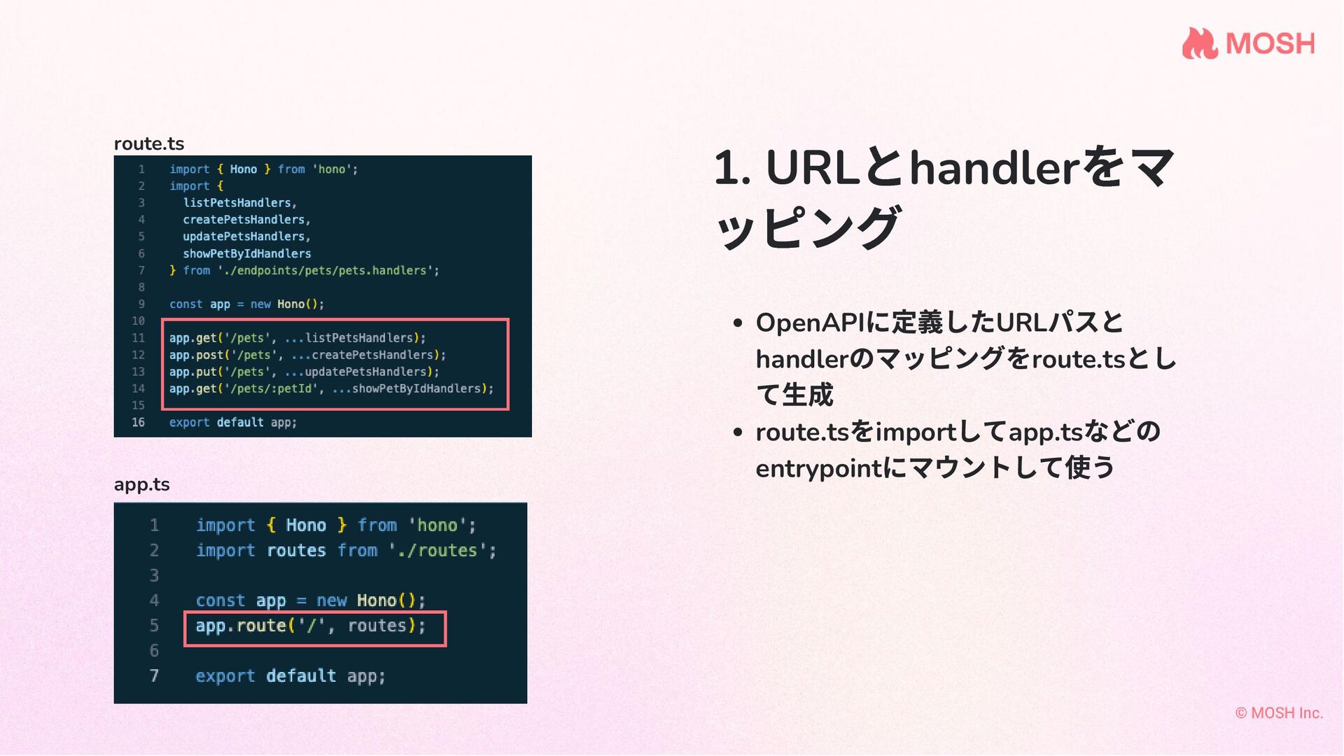 1. URL とhandler をマ ッピング OpenAPI に定義したURL パスと handler のマッピングをroute.ts