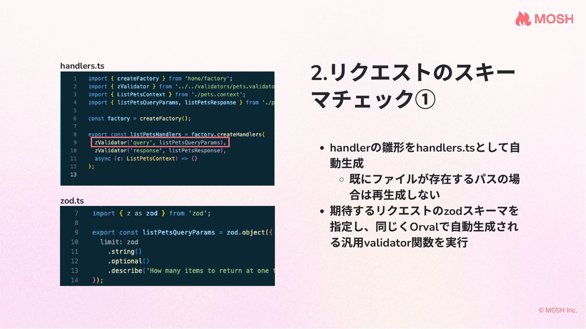 2. リクエストのスキー マチェック① handler の雛形をhandlers.ts として自 動生成 既にファイルが存在するパスの場 合は再生成しない 期待するリクエストのzod