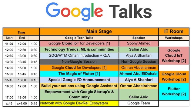 Speaker Workshops 11:20 12:00 1:00 Google Cloud IoT for Developers [1] Sobhy Ahmed 12:00 12:30 0:30 Technology Trends, ML & communities Salim Abid Google Cloud IoT Workshop [2] 12:30 13:00 0:30 GDG/WTM Oman introduction + Q/A Alya AlShanfari 13:00 13:45 0:45 Non-Google Session Non-Google Session 14:00 15:00 1:00 Google Cloud for Developers [1] Omran Abdelrahman 15:00 15:45 0:45 The Magic of Flutter [1] Ahmed Abu ElDahab Google Cloud Workshop [2] 15:45 16:00 0:15 Special Google I/O Announcement Alya AlShanfari 16:00 17:00 1:00 Build your actions using Google Assistant Omran Abdelrahman Flutter Workshop [2] 17:00 18:00 1:00 Empowerment with Google Startup's & Community Salim Abid x:45 x+1:00 0:15 Network with Google DevRel Ecosystem Google Team Talks