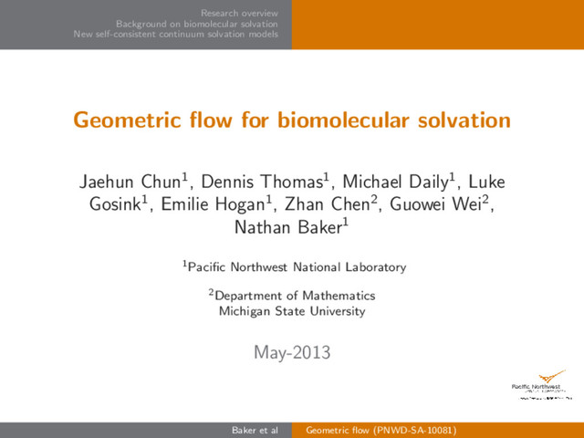 models Geometric flow for biomolecular solvation Jaehun Chun1, Dennis Thomas1, Michael Daily1, Luke Gosink1, Emilie Hogan1, Zhan Chen2, Guowei Wei2, Nathan Baker1 1Pacific Northwest National Laboratory 2Department of Mathematics Michigan State University May-2013 Baker et al Geometric flow (PNWD-SA-10081)
