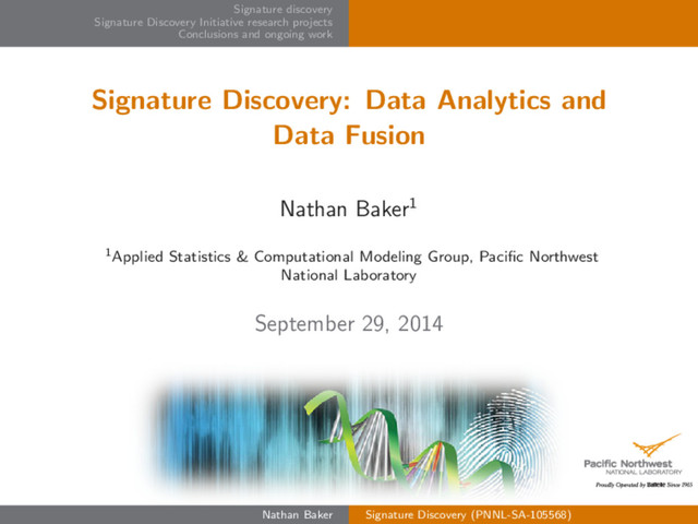 work References I [Amidan et al., 2014] Amidan BG, Orton DJ, LaMarche BL, Monroe ME, Moore RJ, Smith DJ, Sego LH, Payne SH, Tardiff MF. Signatures for Mass Spectrometry Data Quality. Journal of Proteome Research, 13, 2215-22, 2014. http://dx.doi.org/0.1021/pr401143e [Baker et al., 2013] Baker NA, Barr JL, Bonheyo GT, Joslyn CA, Krishnaswami K, Oxley ME, Quadrel R, Sego LH, Tardiff MF, Wynne AS. Research towards a systematic signature discovery process. IEEE Intelligence and Security Informatics Signature Discovery Workshop, 2013. http://dx.doi.org/10.1109/ISI.2013.6578848 [Jarman et al., 2008] Jarman K, Kreuzer-Martin H, Wunschel D, Valentine N, Cliff J, Petersen C, Colburn H, Wahl K. Bayesian-Integrated Microbial Forensics. Applied and Environmental Microbiology, 74, 3573-82, 2008. http://dx.doi.org/10.1128/aem.02526-07 Nathan Baker Signature Discovery (PNNL-SA-105568)