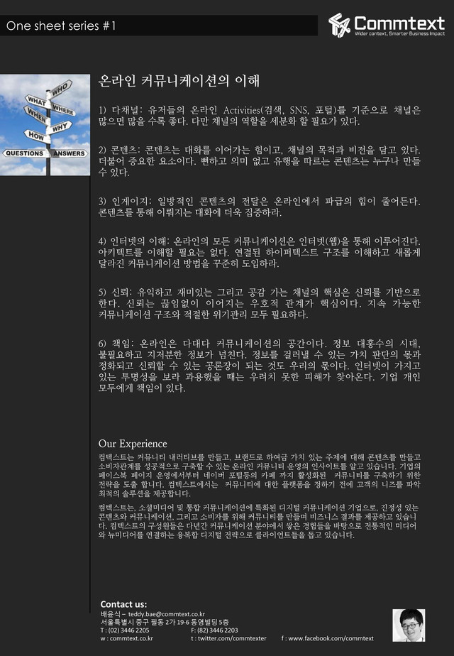[email protected] 서울특별시 중구 필동 2가 19-6 동영빌딩 5층 T : (02) 3446 2205 F: (82) 3446 2203 w : commtext.co.kr t : twitter.com/commtexter f : www.facebook.com/commtext One sheet series #1
