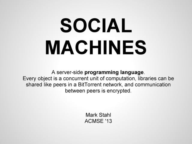 concurrent unit of computation, libraries can be shared like peers in a BitTorrent network, and communication between peers is encrypted. Mark Stahl ACMSE '13