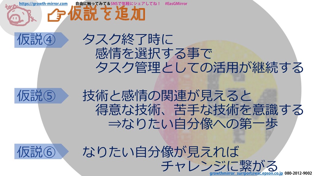 技術と感情の関連が見えると 得意な技術、苦手な技術を意識する ⇒なりたい自分像への第一歩 仮説⑥ なりたい自分像が見えれば チャレンジに繋がる 仮説を追加