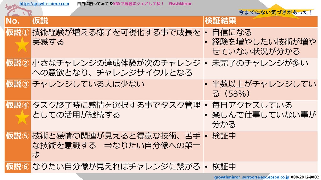 実感する • 自信になる • 経験を増やしたい技術が増や せていない状況が分かる 仮説② 小さなチャレンジの達成体験が次のチャレンジ への意欲となり、チャレンジサイクルとなる • 未完了のチャレンジが多い 仮説③ チャレンジしている人は少ない • 半数以上がチャレンジしてい る(58%) 仮説④ タスク終了時に感情を選択する事でタスク管理 としての活用が継続する • 毎日アクセスしている • 楽しんで仕事していない事が 分かる 仮説⑤ 技術と感情の関連が見えると得意な技術、苦手 な技術を意識する ⇒なりたい自分像への第一 歩 • 検証中 仮説⑥ なりたい自分像が見えればチャレンジに繋がる • 検証中 今までにない気づきがあった!