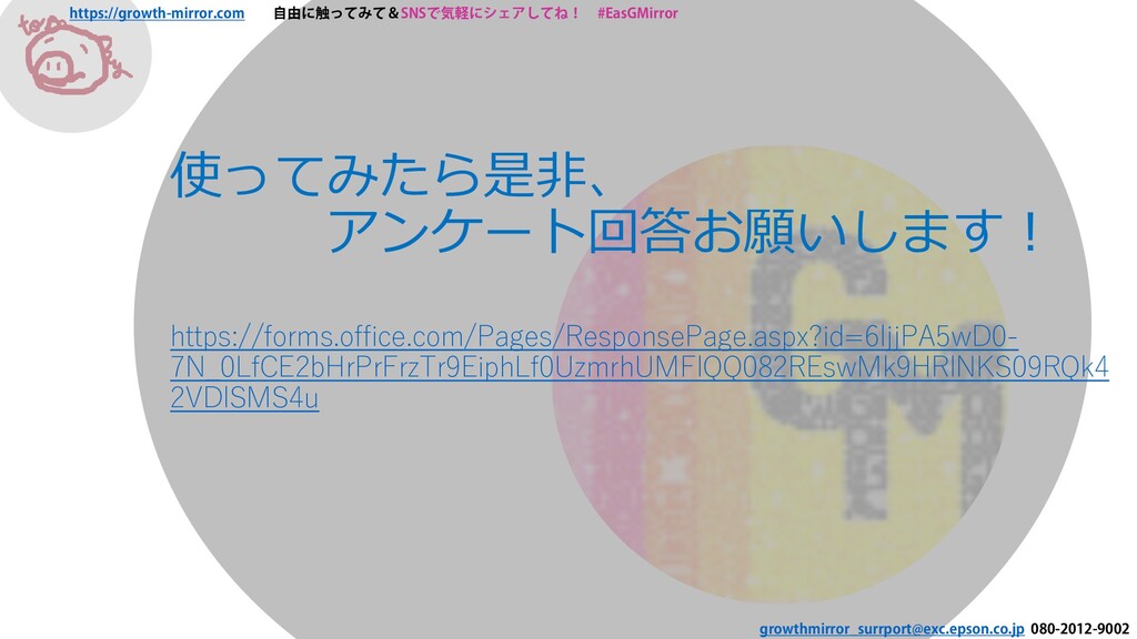 080-2012-9002 使ってみたら是非、 アンケート回答お願いします! https://forms.office.com/Pages/ResponsePage.aspx?id=6ljjPA5wD0- 7N_0LfCE2bHrPrFrzTr9EiphLf0UzmrhUMFlQQ082REswMk9HRlNKS09RQk4 2VDlSMS4u