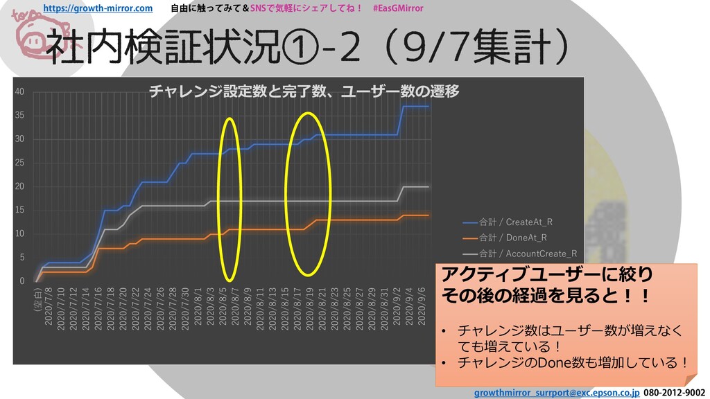 20 25 30 35 40 (空白) 2020/7/8 2020/7/10 2020/7/12 2020/7/14 2020/7/16 2020/7/18 2020/7/20 2020/7/22 2020/7/24 2020/7/26 2020/7/28 2020/7/30 2020/8/1 2020/8/3 2020/8/5 2020/8/7 2020/8/9 2020/8/11 2020/8/13 2020/8/15 2020/8/17 2020/8/19 2020/8/21 2020/8/23 2020/8/25 2020/8/27 2020/8/29 2020/8/31 2020/9/2 2020/9/4 2020/9/6 チャレンジ設定数と完了数、ユーザー数の遷移 合計 / CreateAt_R 合計 / DoneAt_R 合計 / AccountCreate_R アクティブユーザーに絞り その後の経過を見ると!! • チャレンジ数はユーザー数が増えなく ても増えている! • チャレンジのDone数も増加している!