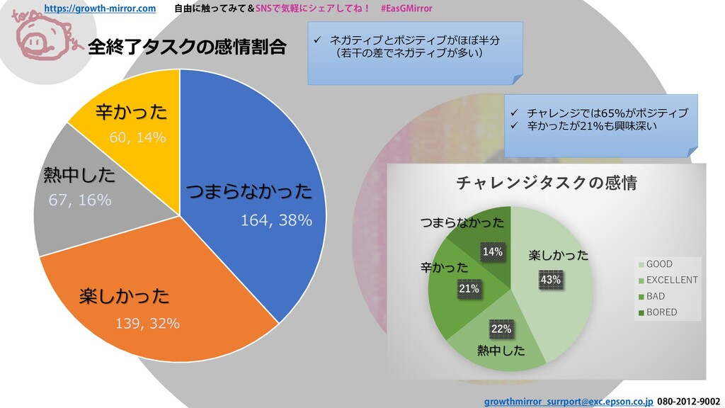 16% 60, 14% 全終了タスクの感情割合 BORED GOOD EXCELLENT BAD つまらなかった 辛かった 熱中した 楽しかった ネガティブとポジティブがほぼ半分 (若干の差でネガティブが多い) 43% 22% 21% 14% チャレンジタスクの感情 GOOD EXCELLENT BAD BORED つまらなかった 辛かった 熱中した 楽しかった チャレンジでは65%がポジティブ 辛かったが21%も興味深い