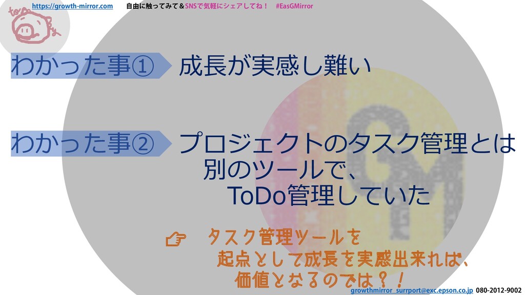 080-2012-9002 わかった事① 成長が実感し難い わかった事② プロジェクトのタスク管理とは 別のツールで、