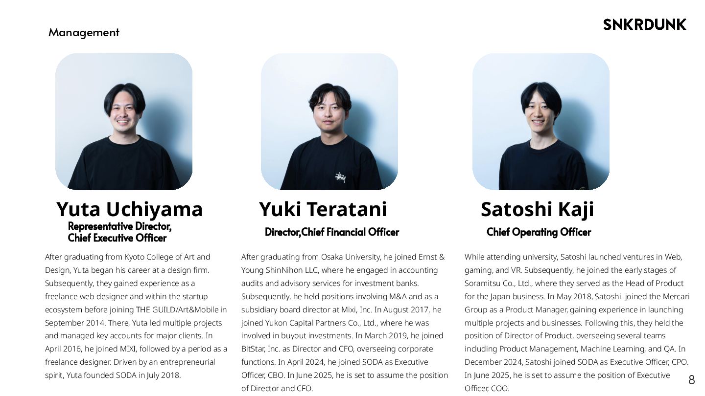 Director,Chief Financial Officer After graduating from Osaka University, he joined Ernst & Young ShinNihon LLC, where he engaged in accounting audits and advisory services for investment banks. Subsequently, he held positions involving M&A and as a subsidiary board director at Mixi, Inc. In August 2017, he joined Yukon Capital Partners Co., Ltd., where he was involved in buyout investments. In March 2019, he joined BitStar, Inc. as Director and CFO, overseeing corporate functions. In April 2024, he joined SODA as Executive Officer, CBO. In June 2025, he is set to assume the position of Director and CFO.