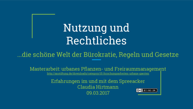 Gesetze Masterarbeit: urbanes Pflanzen- und Freiraummanagement http://anstiftung.de/downloads/category/15-forschungsarbeiten-urbane-gaerten Erfahrungen im und mit dem Spreeacker Claudia Hirtmann 09.03.2017