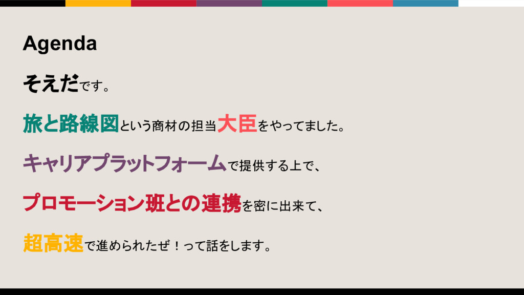 Agenda そえだです。 旅と路線図という商材の担当大臣をやってました。 キャリアプラットフォームで提供する上で、 プロモーション班との連携を密に出来て、 超高速で進められたぜ!って話をします。