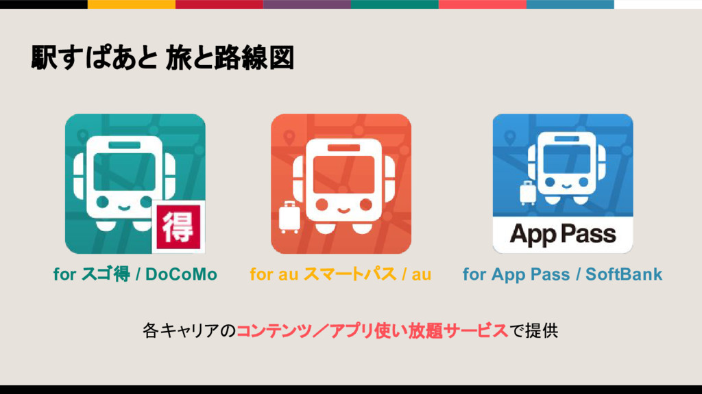 各キャリアのコンテンツ/アプリ使い放題サービスで提供 駅すぱあと 旅と路線図 for スゴ得 / DoCoMo for au スマートパス