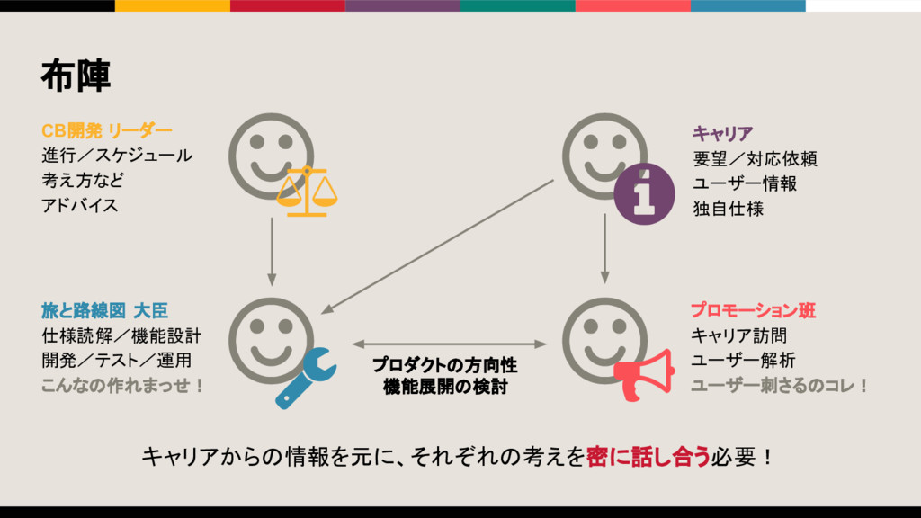 プロダクトの方向性 機能展開の検討 キャリアからの情報を元に、それぞれの考えを密に話し合う必要! キャリア 要望/対応依頼 ユーザー情報 独自仕様 旅と路線図 大臣 仕様読解/機能設計 開発/テスト/運用 こんなの作れまっせ!