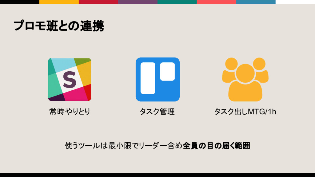 プロモ班との連携 使うツールは最小限でリーダー含め全員の目の届く範囲 タスク出しMTG/1h タスク管理 常時やりとり