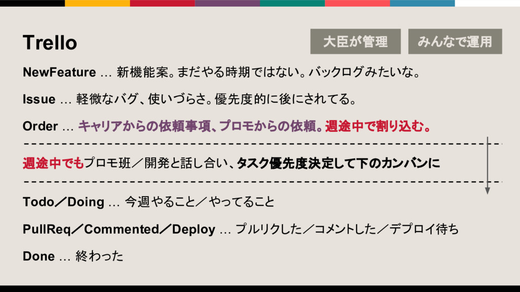 Trello NewFeature … 新機能案。まだやる時期ではない。バックログみたいな。 Issue … 軽微なバグ、使いづらさ。優先度的に後にされてる。 Order … キャリアからの依頼事項、プロモからの依頼。週途中で割り込む。
