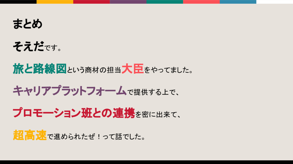まとめ そえだです。 旅と路線図という商材の担当大臣をやってました。 キャリアプラットフォームで提供する上で、 プロモーション班との連携を密に出来て、 超高速で進められたぜ!って話でした。