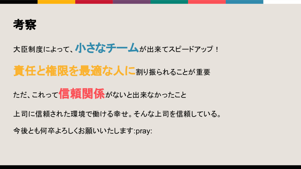 考察 大臣制度によって、小さなチームが出来てスピードアップ! 責任と権限を最適な人に割り振られることが重要 ただ、これって信頼関係がないと出来なかったこと 上司に信頼された環境で働ける幸せ。そんな上司を信頼している。 今後とも何卒よろしくお願いいたします:pray: