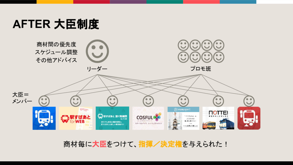 AFTER 大臣制度 商材毎に大臣をつけて、指揮/決定権を与えられた! 大臣= メンバー リーダー プロモ班 商材間の優先度 スケジュール調整 その他アドバイス